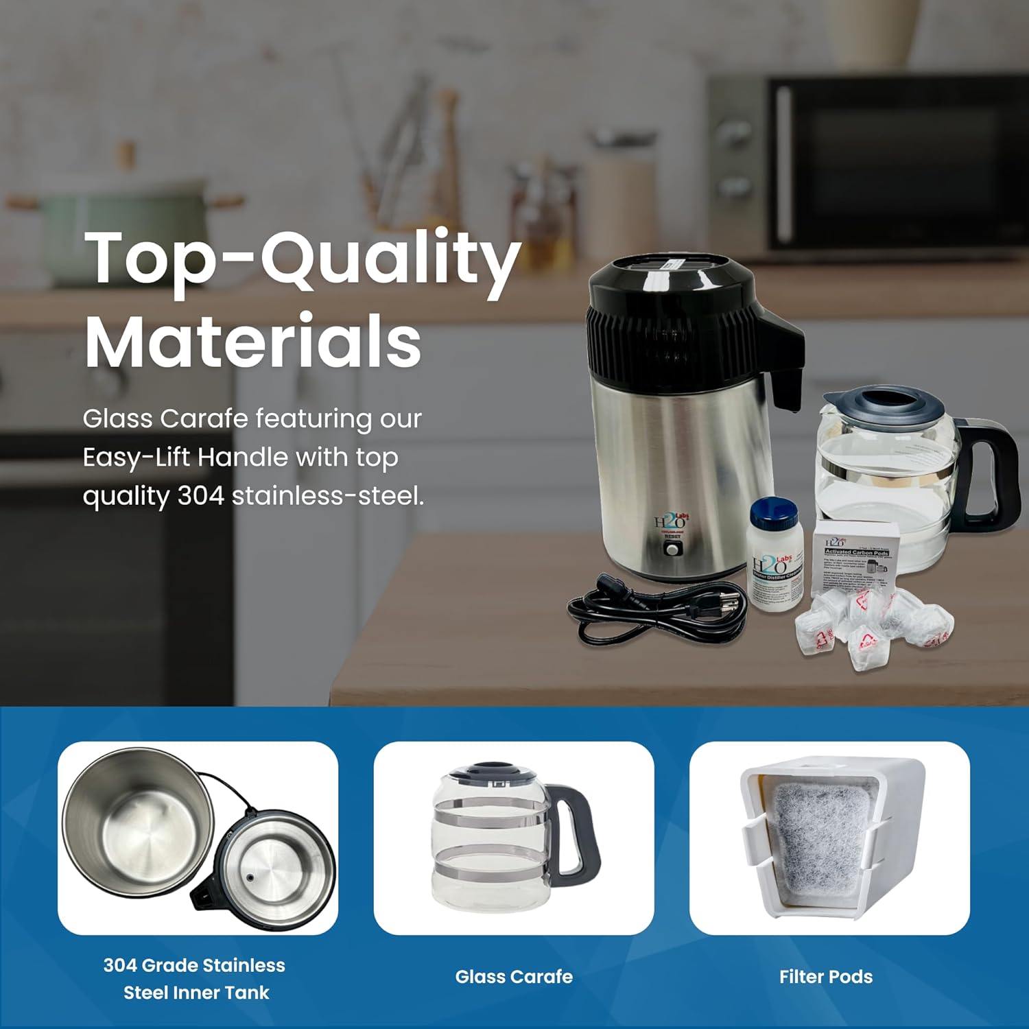 - H2o Labs Best-in-Class Models: Our most popular countertop Model 300SS water distiller for home & office has a stainless-steel exterior, evaporator & condensing coil, and it has a top-quality 1 gallon glass carafe with ergonomic “Easy Grip” handle.
