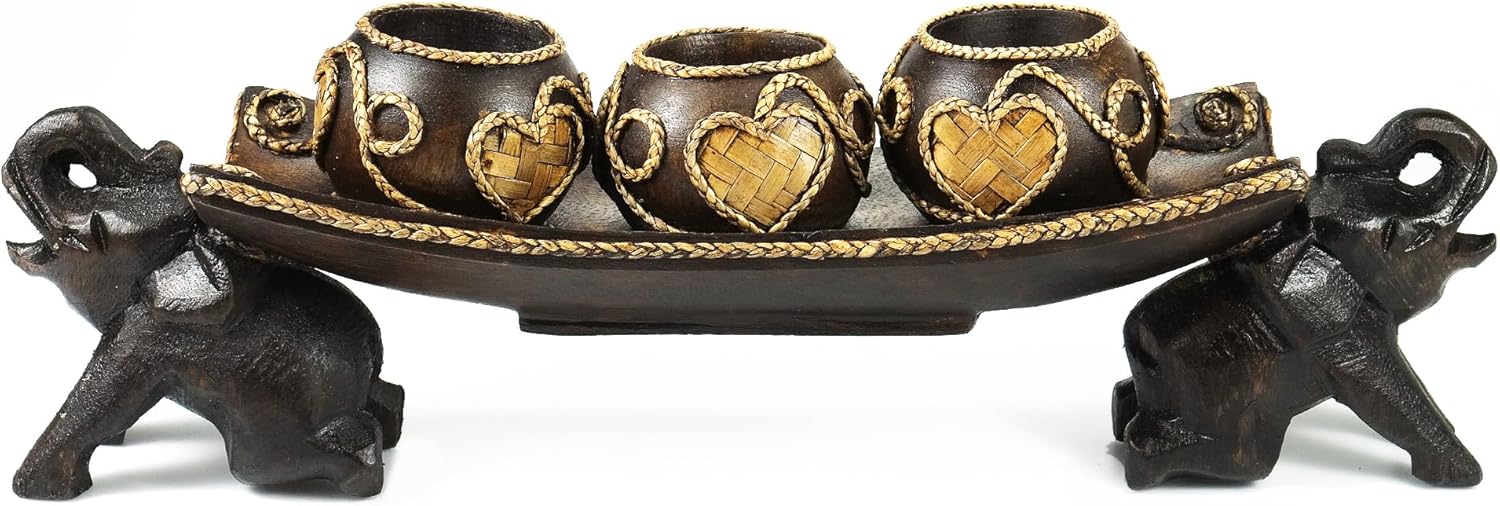 Thai Elephant Tray Carved Rain Tree Wooden Candle Holder
