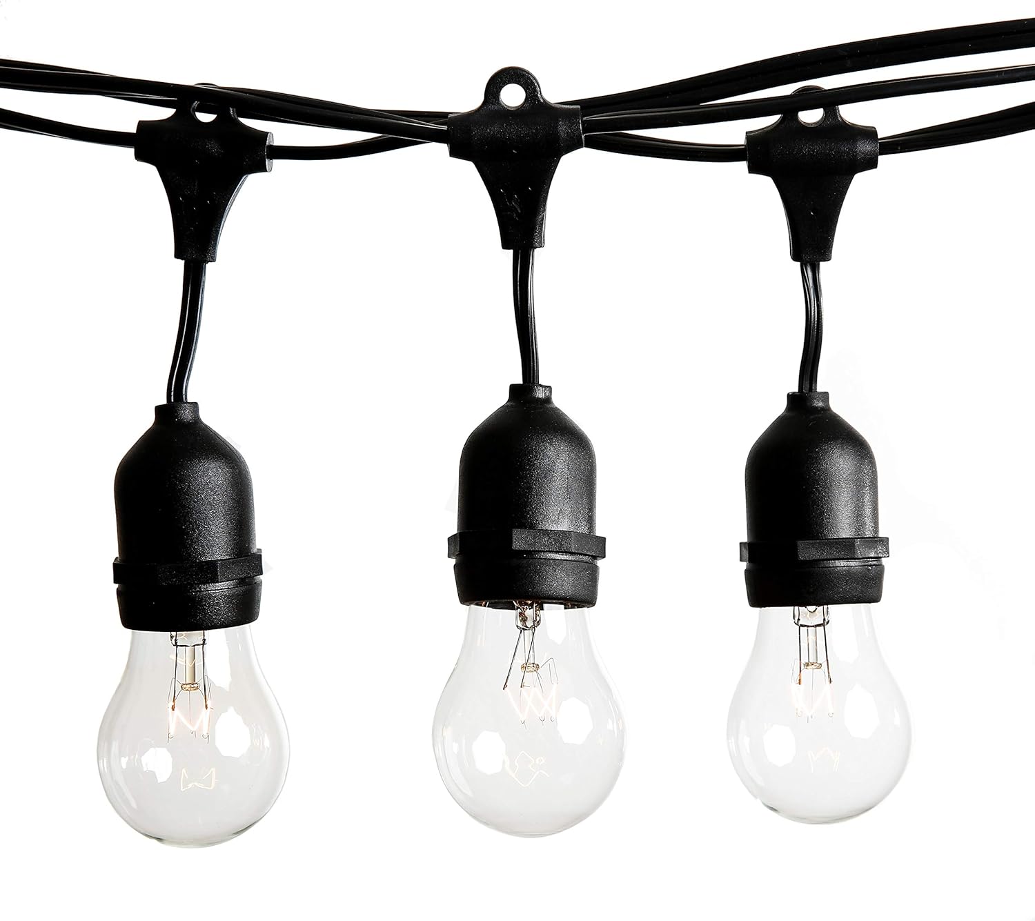 - This outdoor patio string lights set includes one commercial grade 24 foot black suspended socket outdoor light string and 12 A15 Clear glass light bulbs.