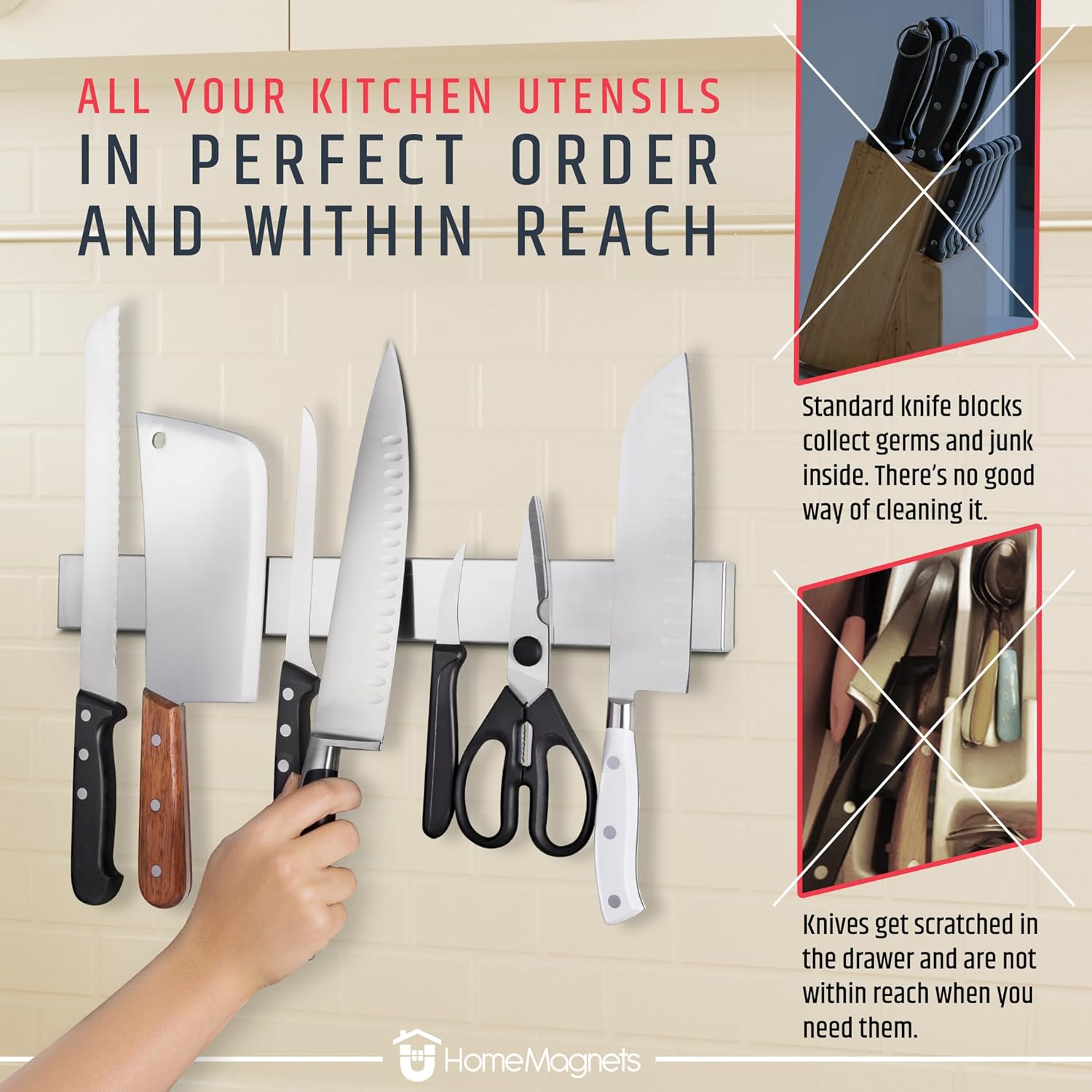 - SAVE COUNTER SPACE: Our magnetic knife strip replaces bulky knife blocks, freeing up counter space and making knives easy to grab. Note: The bar does not have magnetic pull on the back side and is not designed to be magnetized to a fridge.