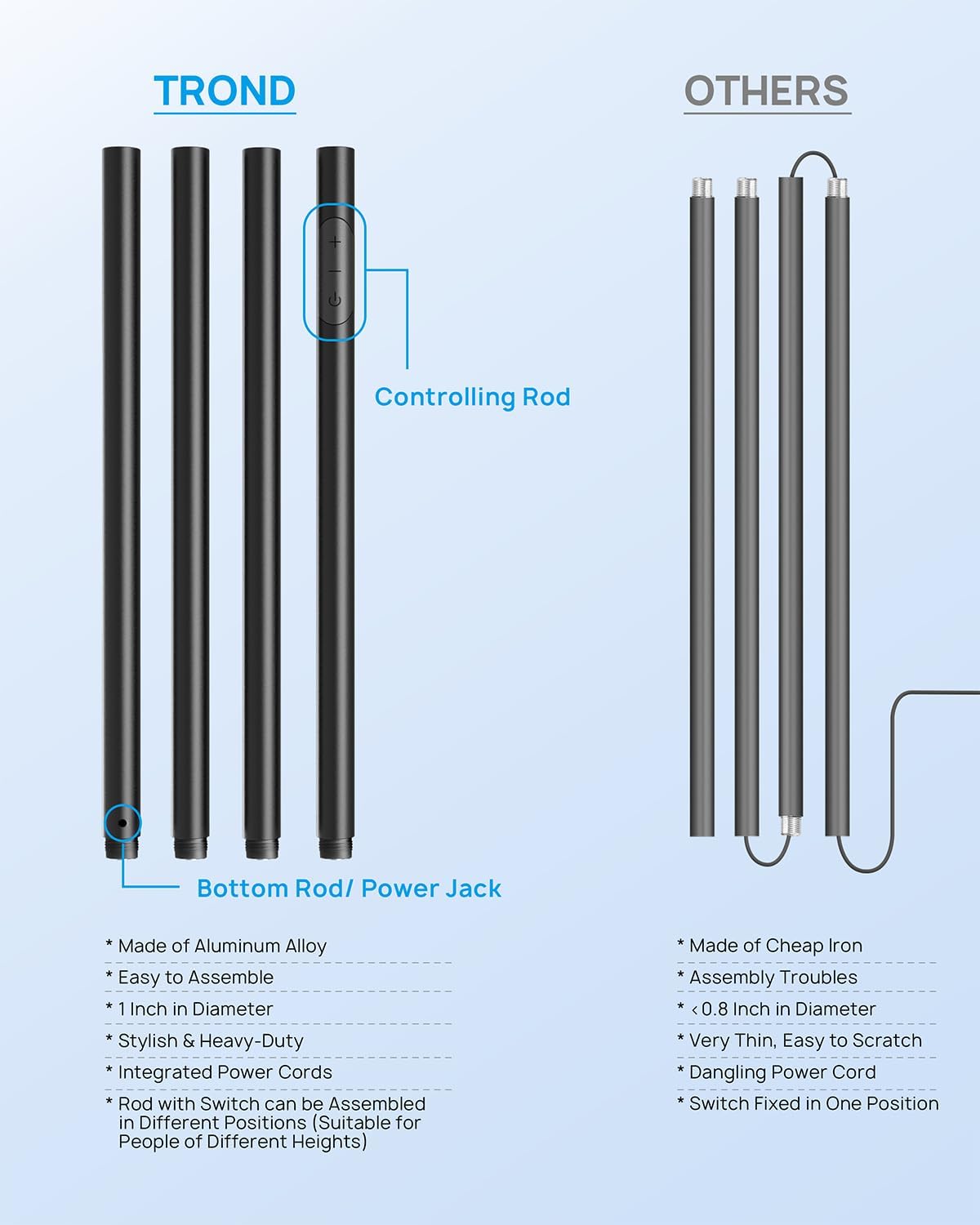 - Modern Tall Floor Lamp: This floor lamp innovatively features 4 modular aluminum rods, all of which have the integrated power cords built inside. This design gives you the convenience and flexibility to assemble, disassemble and adjust the height. Its total height is 180 cm/71 in, taller than other similar lamps, so that you wonβt stare directly at the bright light