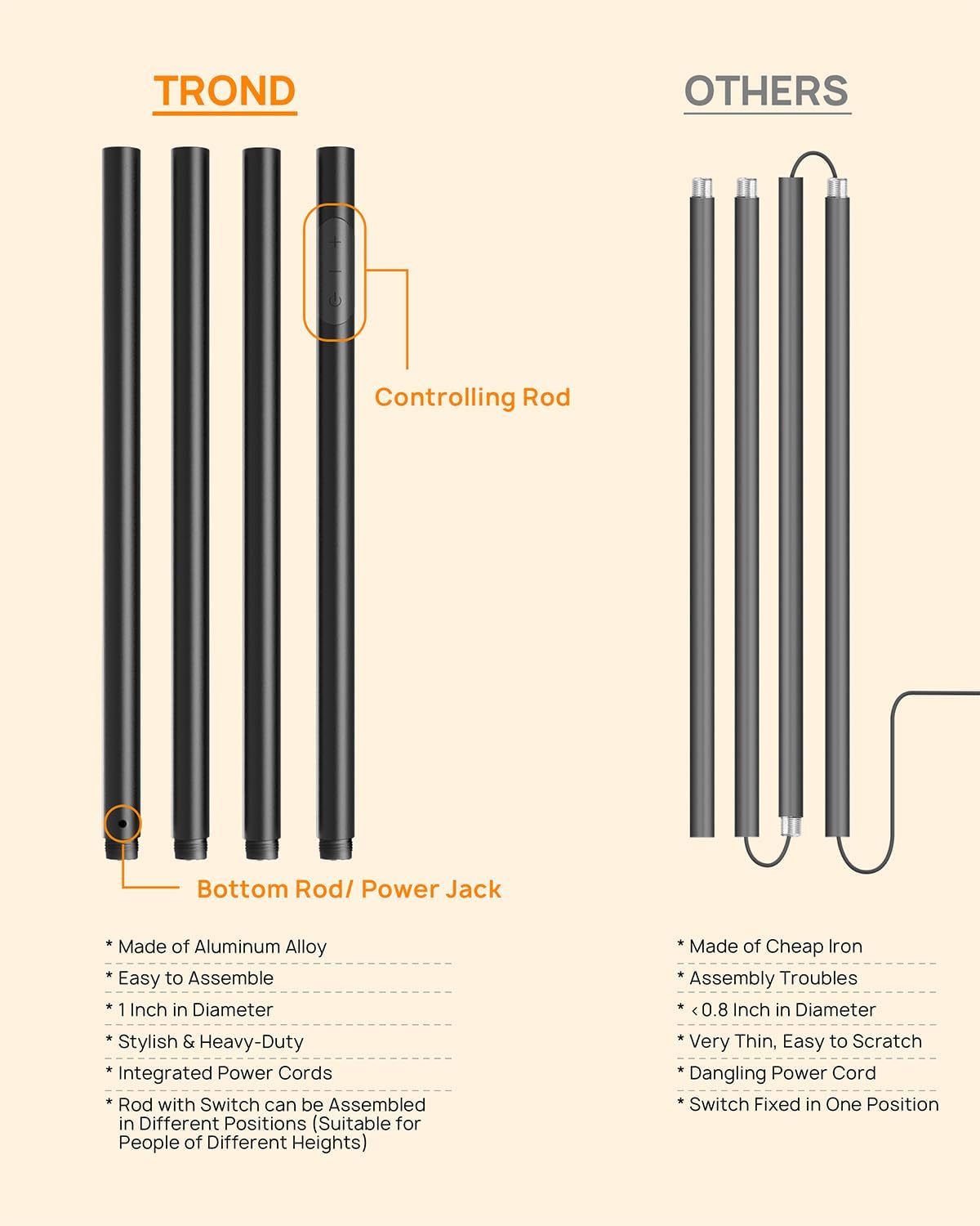 - Modern Warm Light Floor Lamp: This warm light floor lamp innovatively features 4 modular aluminum rods, all of which have the integrated power cords built inside. This design gives you the convenience and flexibility to assemble, disassemble and adjust the height. Its total height is 180 cm/71 in, taller than other similar lamps, so that you wonโt stare directly at the bright light