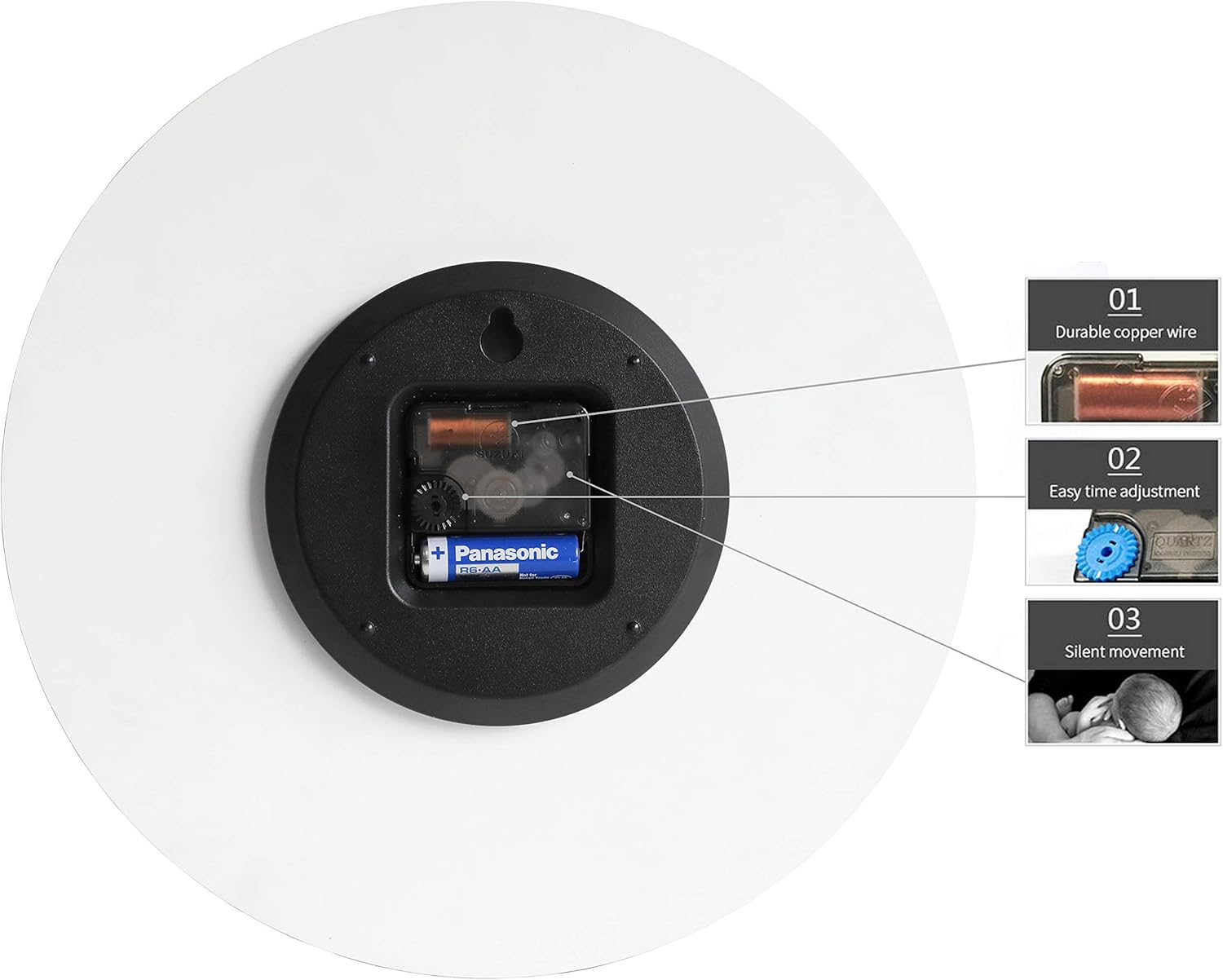 - Wall clock is completely silent thanks to a special Silent Quartz Mechanism that features a continuous, high torque smooth sweep motion that completely eliminates any ticking noise which may distract or interrupt you or others in the room.