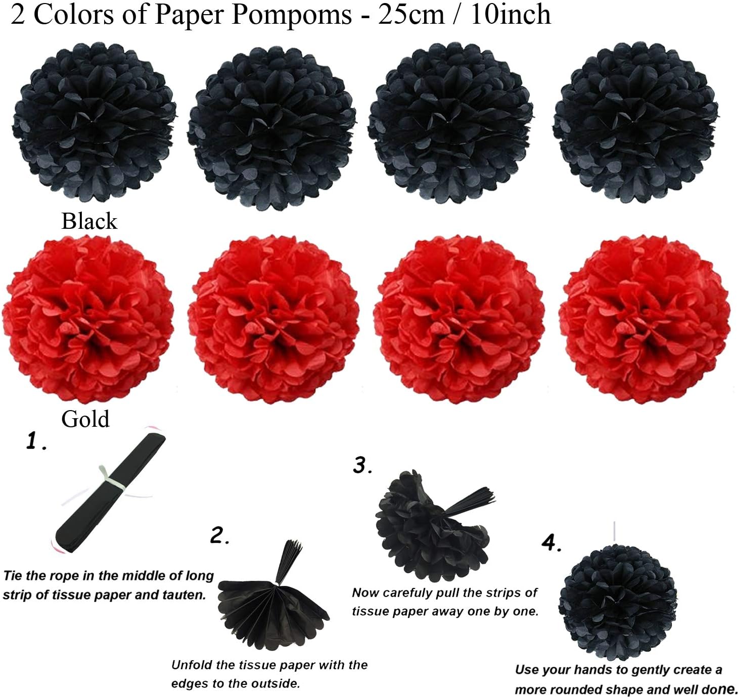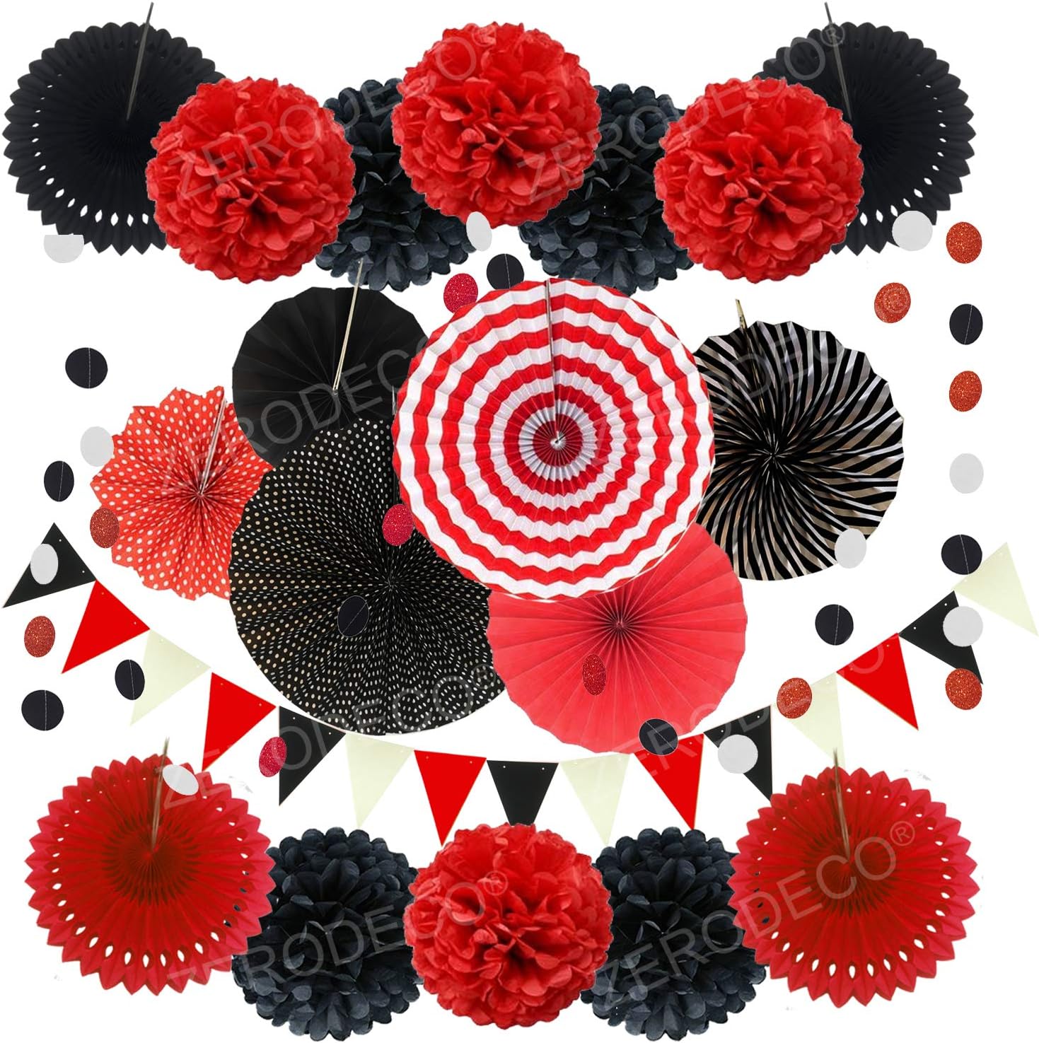 • Includes: 1 x 6.5ft Triangular pennants, 8 x 10inch/25cm Paper pompoms, 6 x 10inch/25cm Paper fans, 4 x Paper hollow fans, 2 x 6.5ft Circle Paper Garland. ( Color: Black, Red and White)