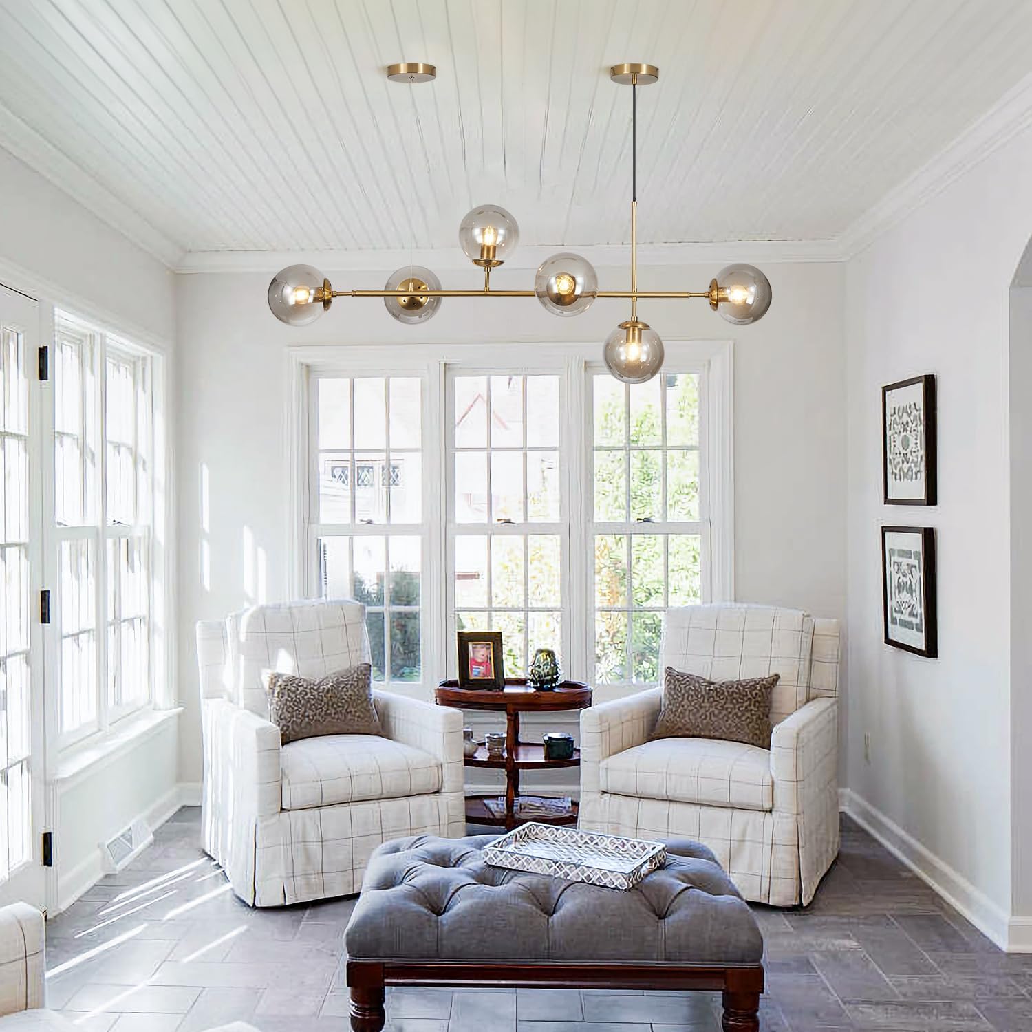 - 【Wide Application】The 6-light glass globe linear sputnik chandelier will lighting up your living space and bringing you a rich artistic atmosphere. The latest design with most modern look always match your home best! You can place it in living room, kitchen island, bedroom, dining room, kitchen sink, study room, guest room, master room, hallway, entryways, corridor foyer any room you like. The off center light fixture is also good for office, coffee bar, lobby, restaurant.