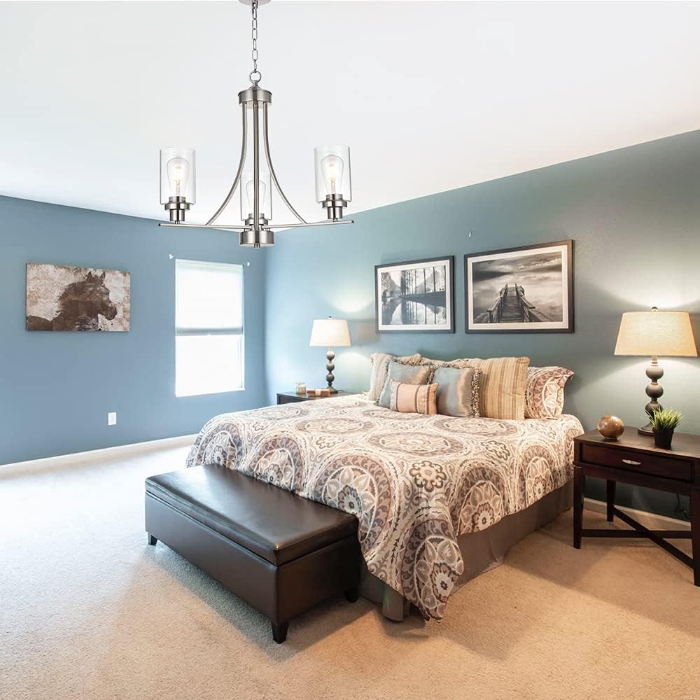 - π 3 Light Modern Glass Chandelier: This rustic kitchen dining room chandelier with high clear glass shadesοΌit is an elegant update for traditional and modern homes alike.It's the perfect light fixture to install in kitchen, island, dining room,living room,foyers ,hallway,bedroom,coffee bar, lobby, restaurant and any space you like.