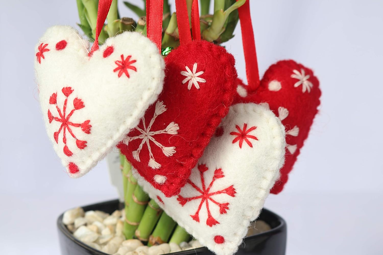 - ✅SPECIFICATIONS: Package includes a set of 4 White and Red Large Hearts Christmas Ornaments with special ribbon loop for hanging. Measures Approx. 3"L x 2.5"W. Comes in a Handmade Organic Cotton Pouch. Traditional hand embroidery allowing you to create beautiful decoration this holiday season.