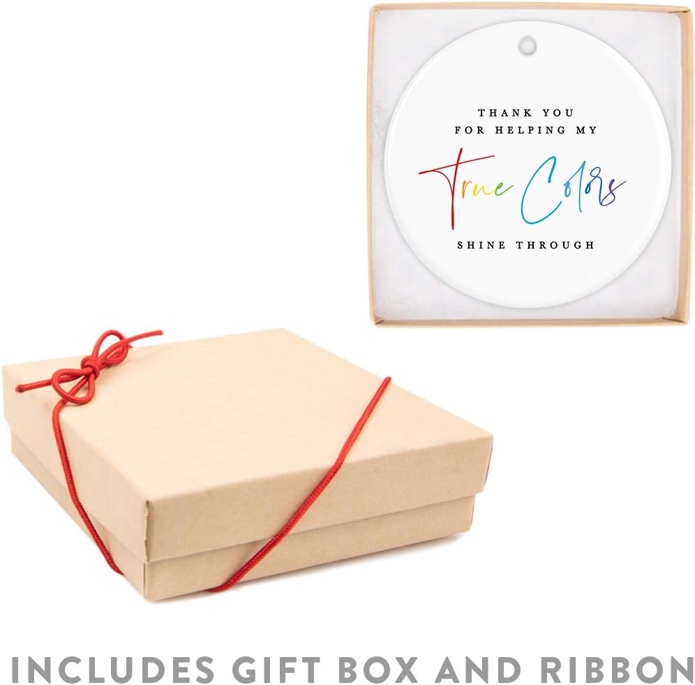 Andaz Press Round Ceramic Porcelain Christmas Tree Ornament for Teacher Thank You Appreciation Graduation Gift, Thank You for Heling My True Colors Shine Through, Rainbow Graphic, 1-Pack