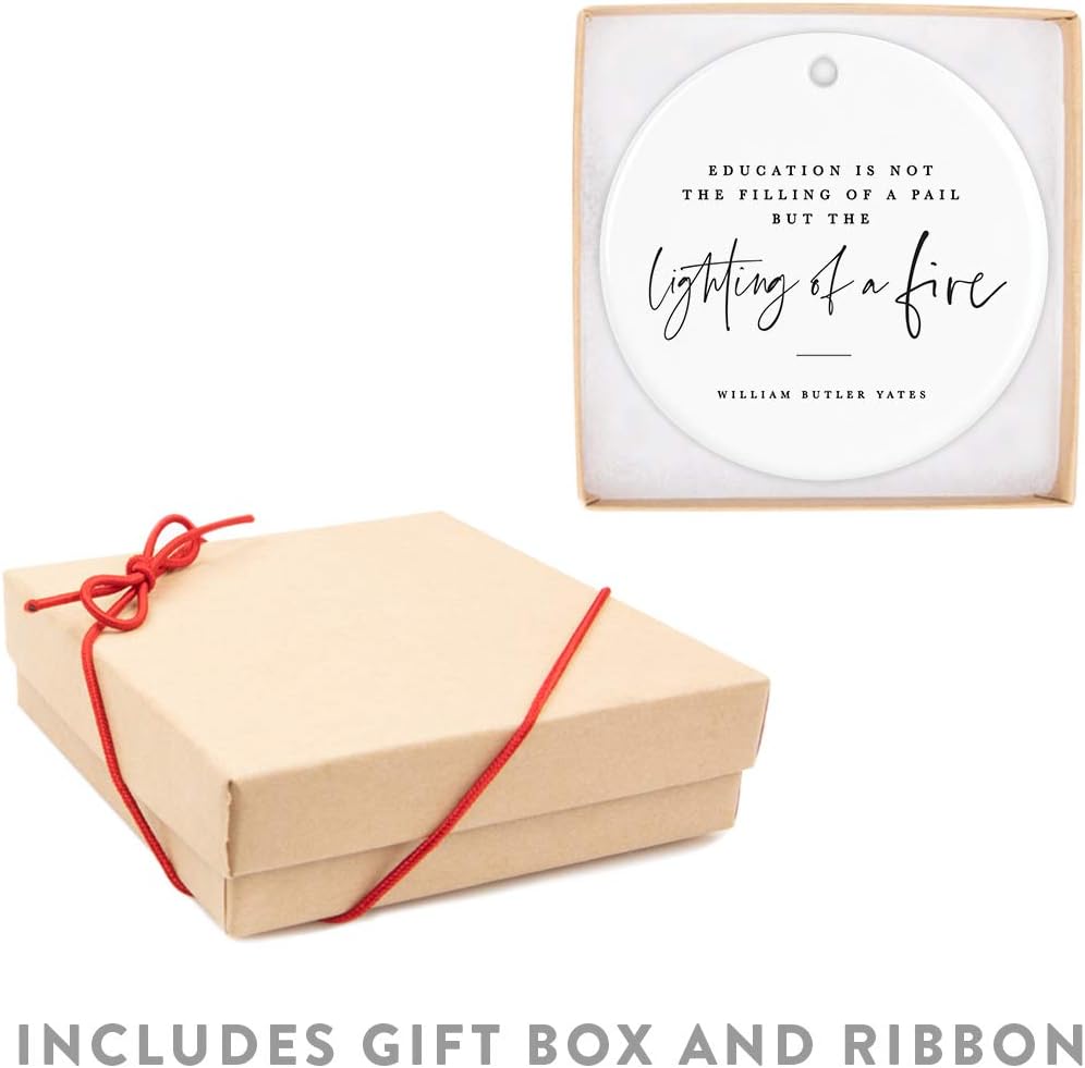 Andaz Press Round Ceramic Porcelain Christmas Tree Ornament for Teacher Thank You Appreciation Graduation Gift, Education is Not The of a Pail But The Lighting of a Fire, William Butler Yeats, 1-Pack