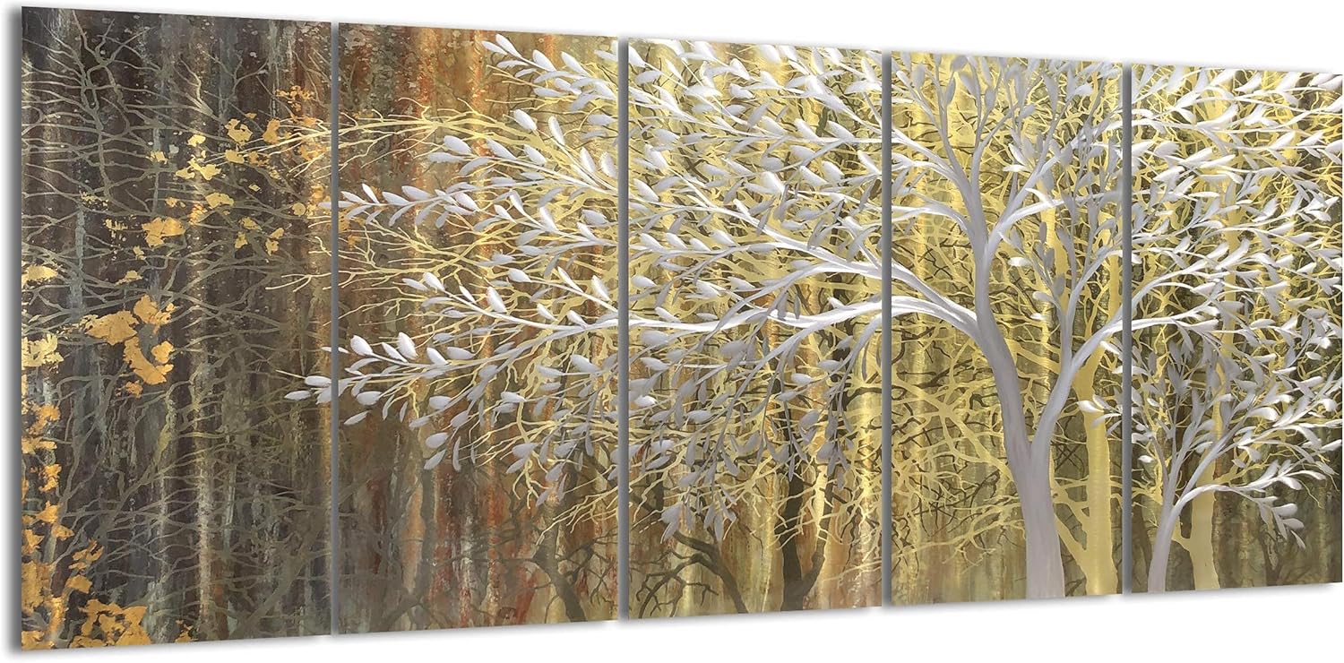 Yihui Arts Gold Metal Wall Art Handcrafted Tree on Aluminum Artwork Modern Forest Pictures with 3D for Living Room Bedroom Kitchen Decor