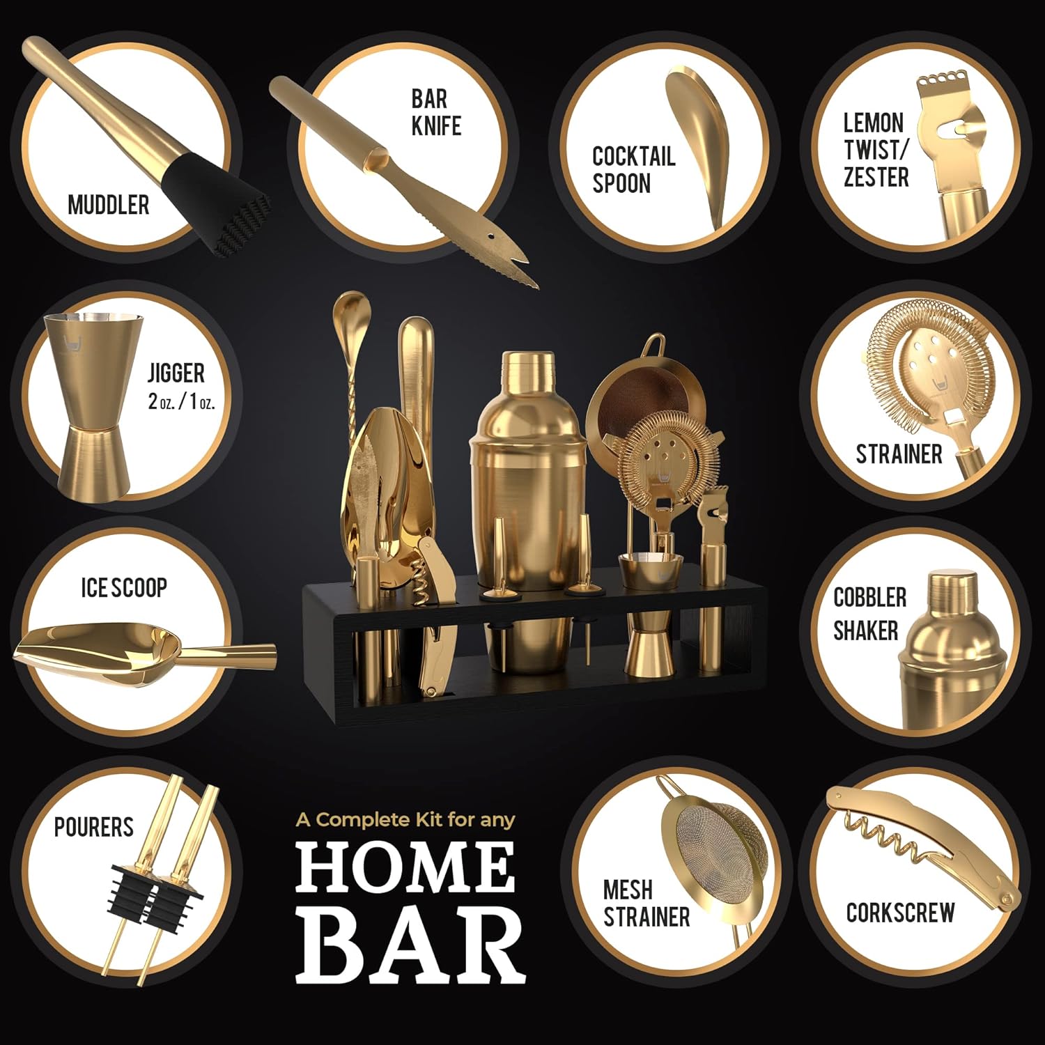 Highball & Chaser Bartender Kit with Espresso Bamboo Stand. Beautiful Cobbler Cocktail Shaker Set with Bar Tools Rustproof Stainless Steel Bar Set (Matte Gold)