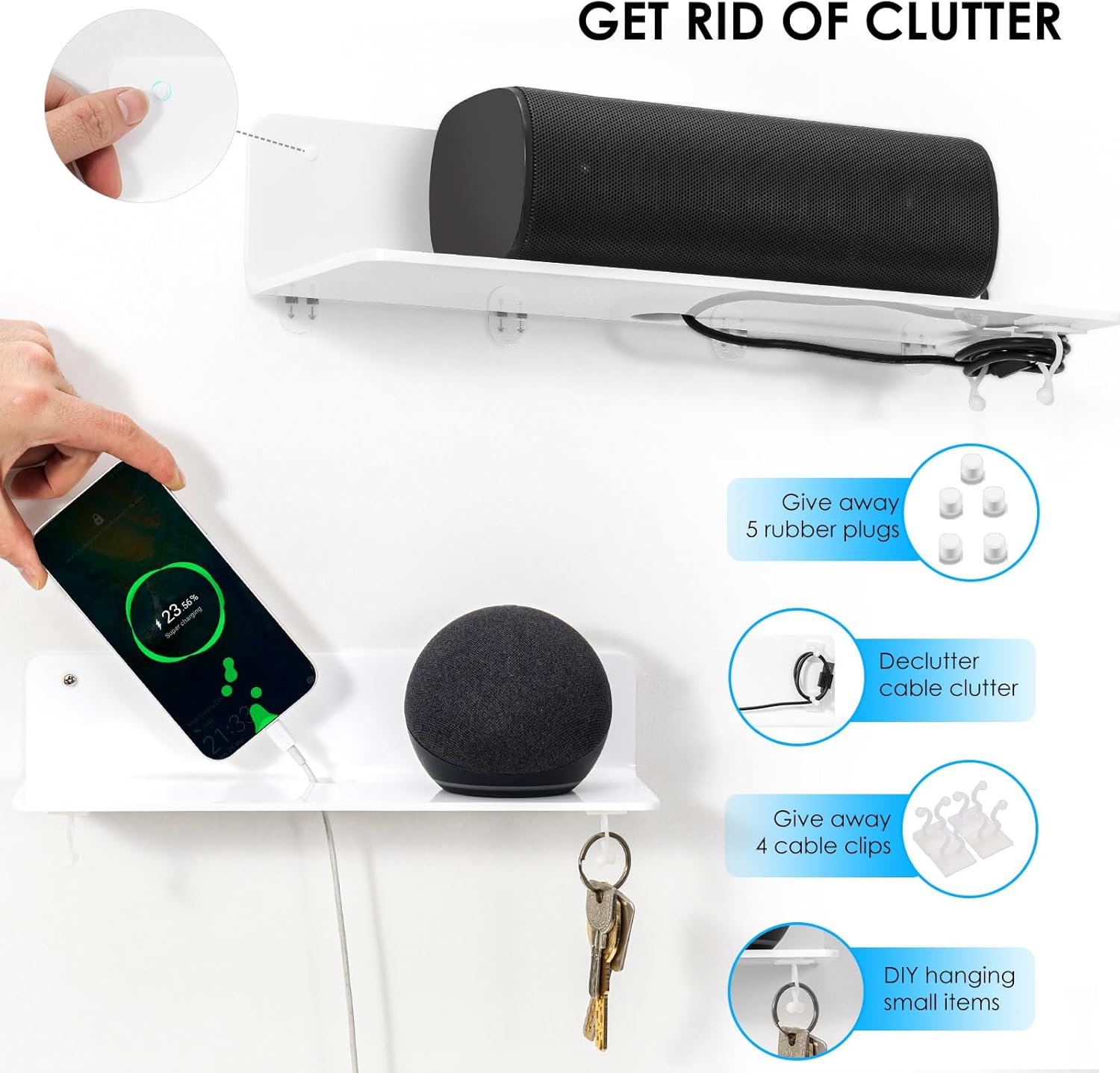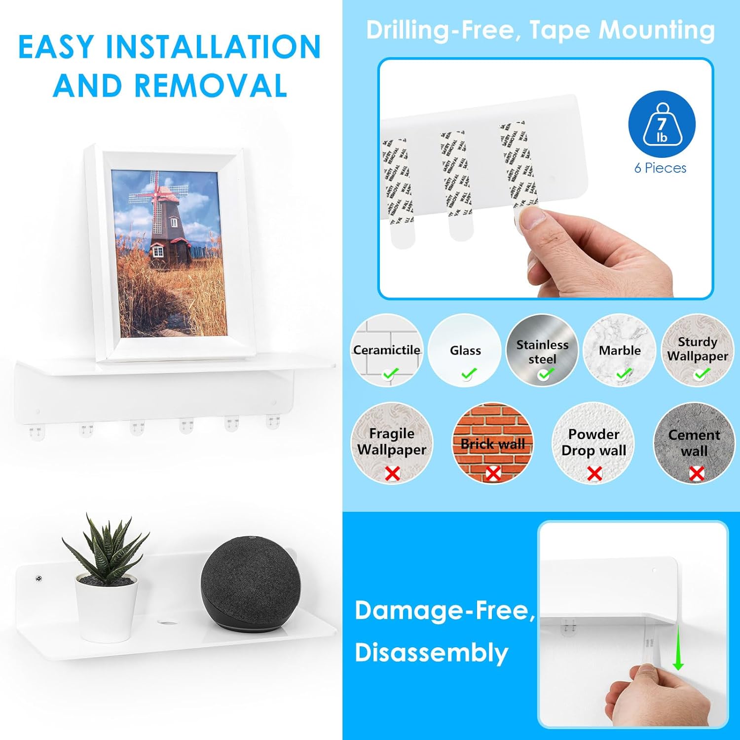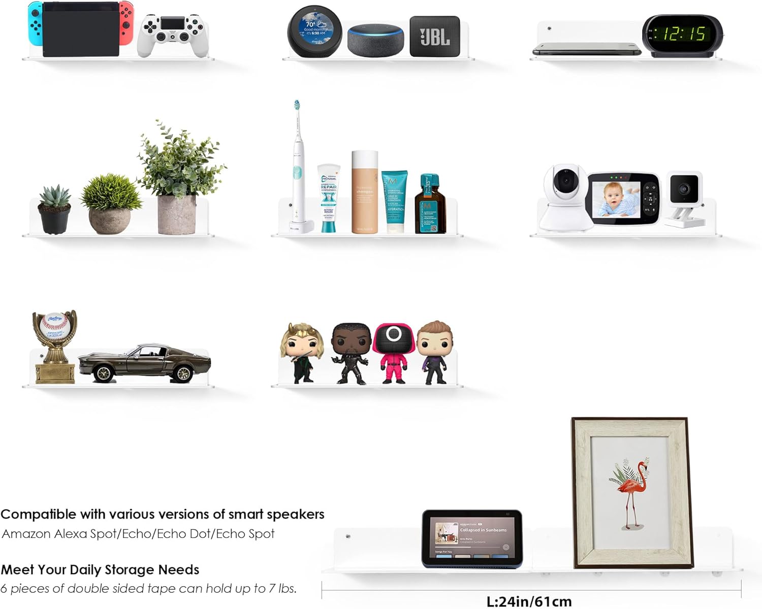 • DURABLE & STRONG: The white acrylic shelves are made of high-quality acrylic, exquisite workmanship, durable and strong enough to hold up to 7 pounds. Convenient and non-damaging storage for items such as cosmetics, smart speakers, baby monitors, action figures, and more.