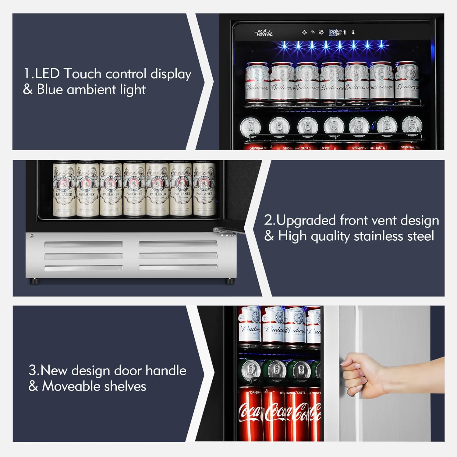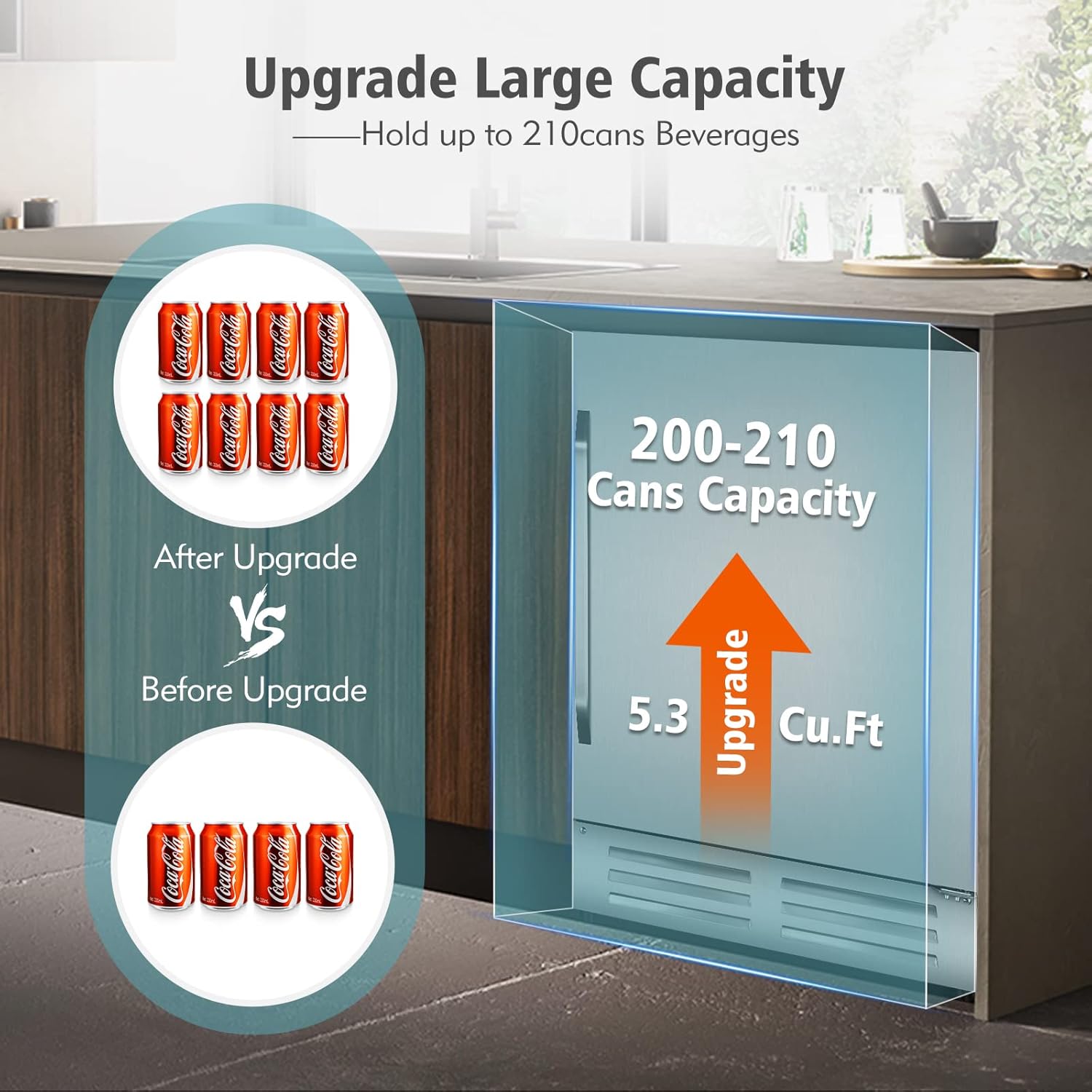 - ă210 Cans Large Capacity Wide refrigerator ăThe beverage refrigerator holds up to 210 cans of drinks. You can cool your favorite beverages or wines in different sizes. Meanwhile, the beverage cooler is equipped with soft LED ambient light which helps brighten your beverage in the dark.