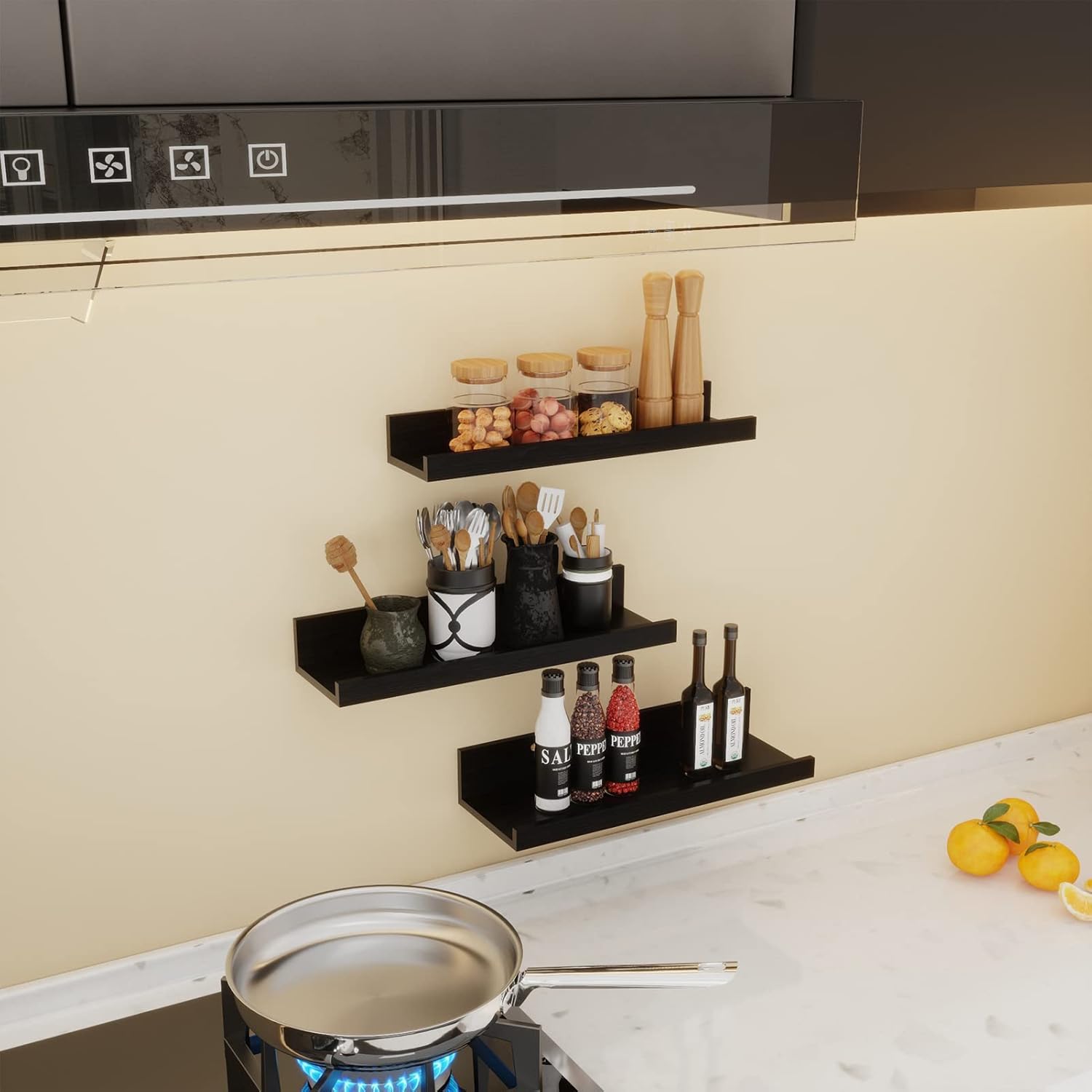 - Multifunctional Shelves Sets: These 3 wall shelves have same 16” length but slightly different width that suit your needs of display and storage. You can tidy up and display bathroom products, spices, small plants, pictures and collectibles from bathroom, bedroom, kitchen to living room and office.