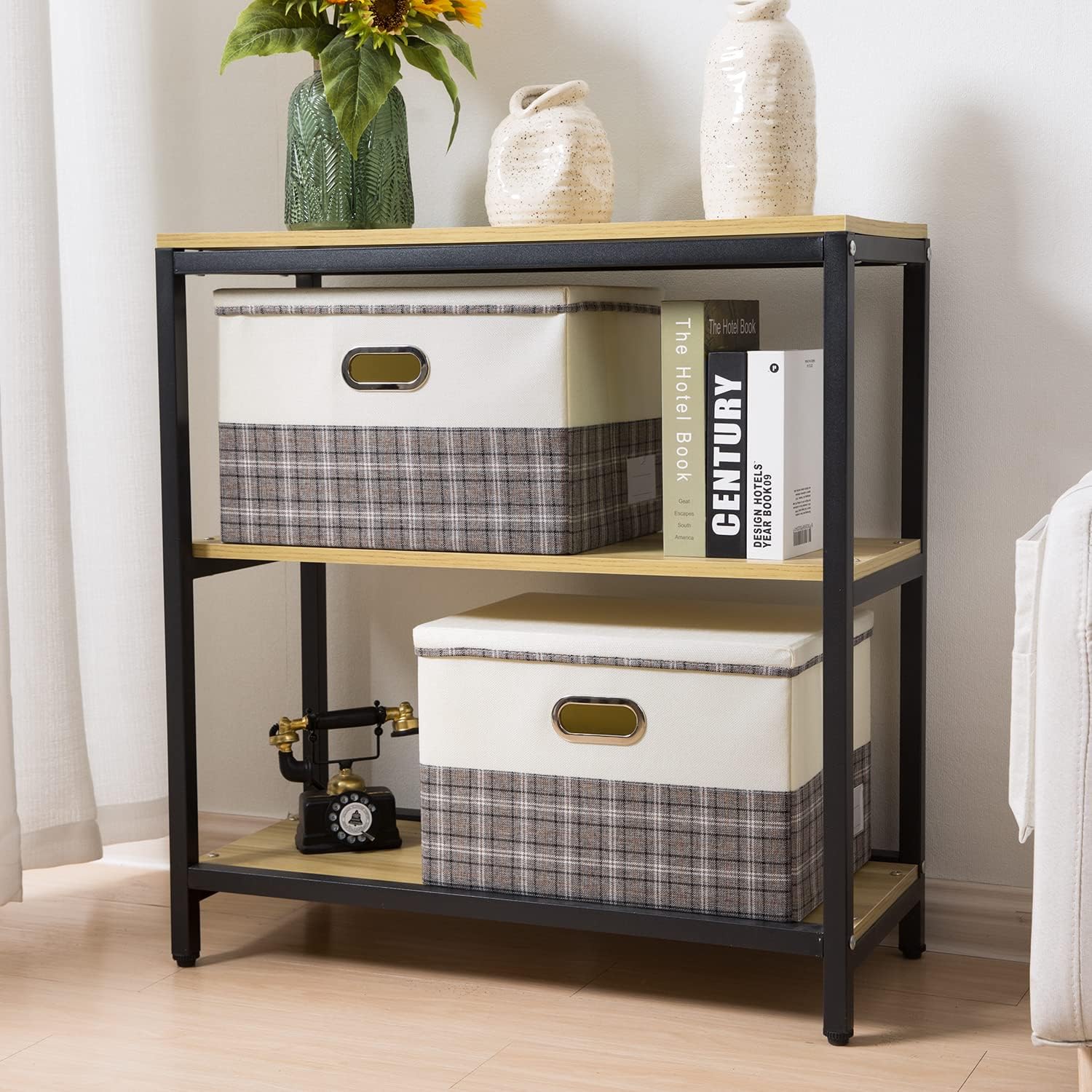 PRANDOM Large Collapsible Storage Bins with Lids [3-Pack] Fabric Foldable Storage Boxes Organizer Containers Baskets Cube with Cover for Home Bedroom Closet Office Gray plaid & Cream(17.7x11.8x11.8)