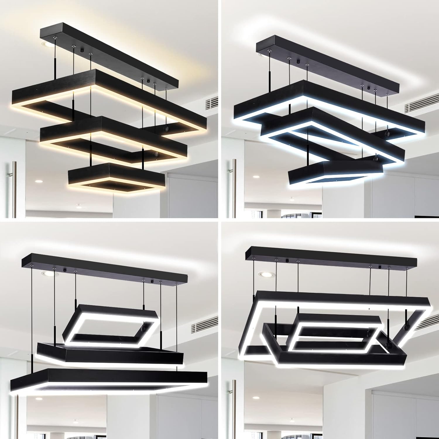 • 【LED Chandelier Modern Pendant Light in Many Shapes】This black modern pendant light with adjustable strings via cable locking pin, hang modern pendant lights for the dining room; DIY before installation and choose your favorite shape; strings can be Adjustable 51.18 inches, perfect for your ceiling height; the 3 rectangular rings of the modern led chandelier can be adjusted at will, making your lighting decoration timeless