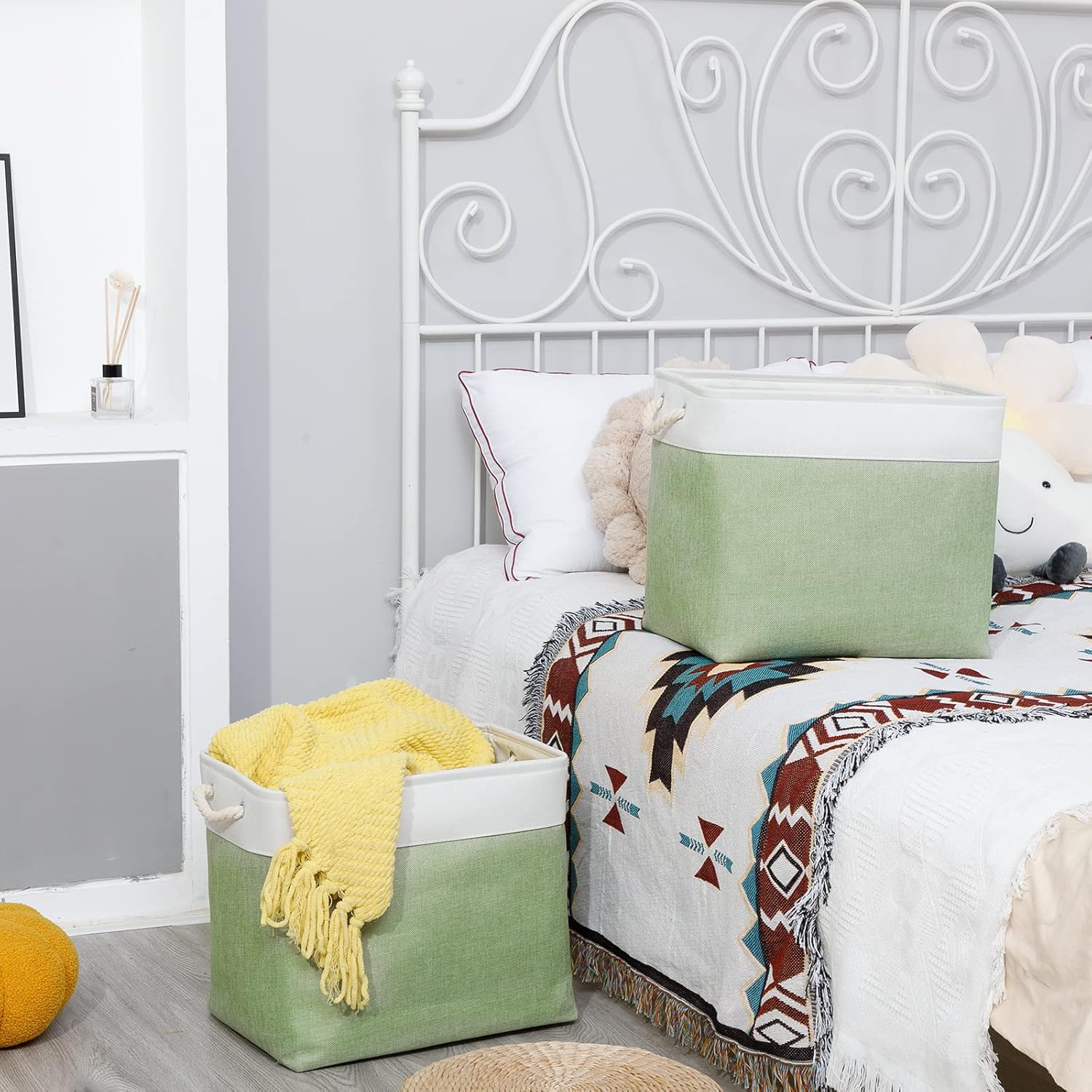 • [Foldable Baskets Set] Simply fold the canvas basket down flat for space-saving storage when not in use or when needing to transport. The basket stays filled for a while and then stays standing. If you mind the creases, you can use an iron to iron the creases in the basket. If you do not use an iron, the creases will slowly disappear as you store your items.