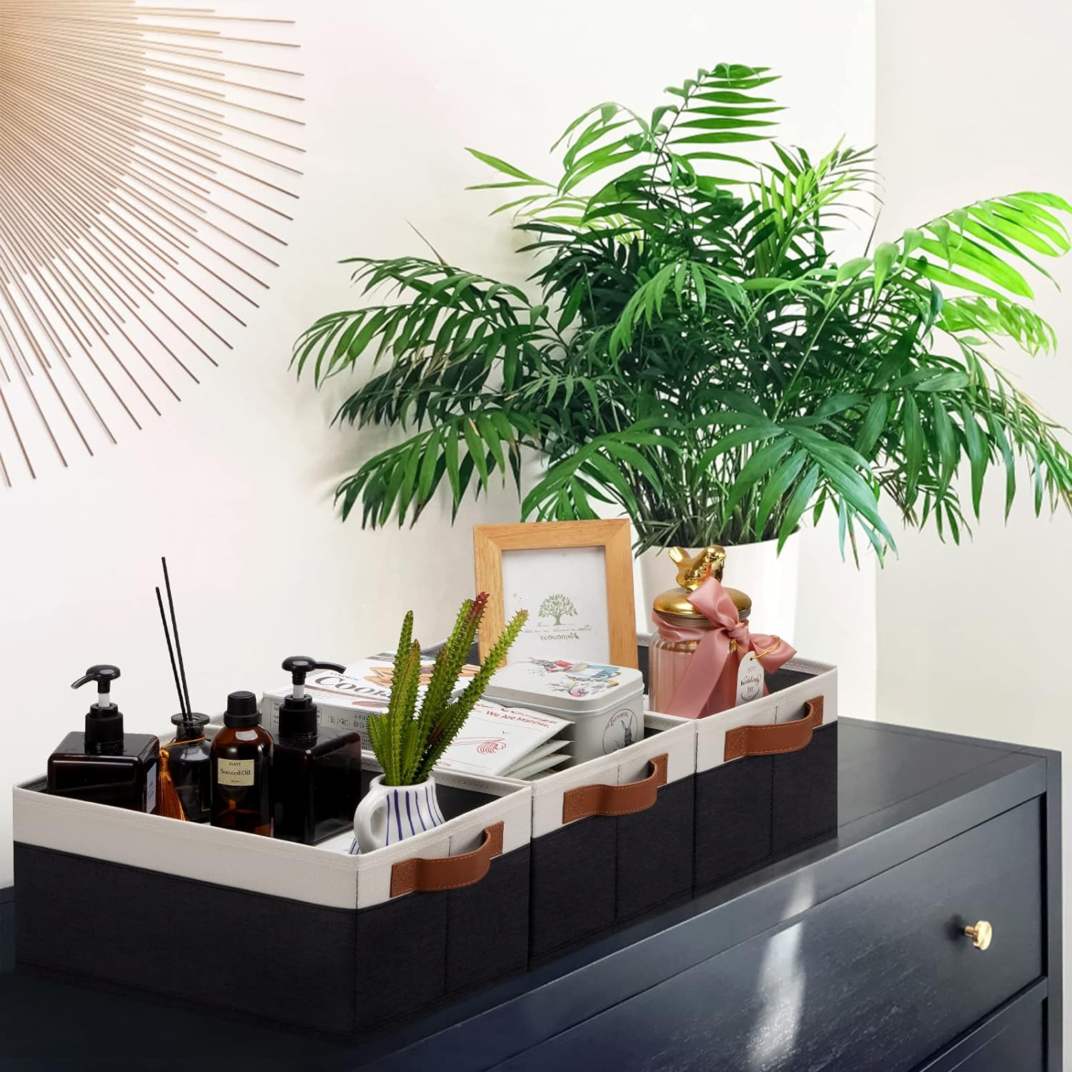 - 👍【QUALITY MATERIAL】Storage baskets for shelves are made of high-quality cationic fabric and polyester cotton fabric, and the inner layer is made of non-woven fabric, which is odorless, long-lasting and strong. Classic faux leather handles that adds a comfortable touch and provides a strong and comfort grip to pull and move. Fabric storage bin is easy to clean, just wipe with a damp sponge or cloth