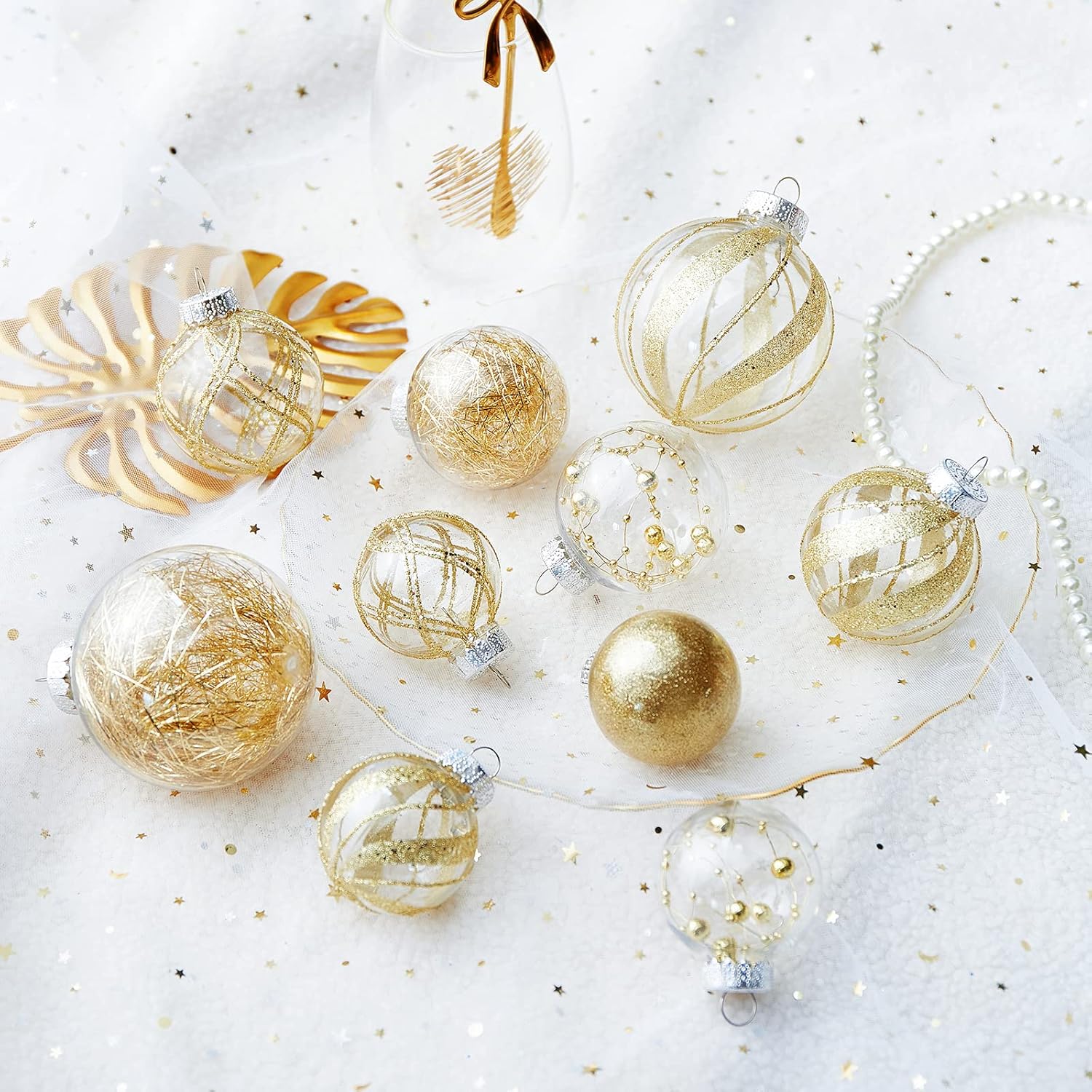 - Gold Christmas Ball Ornaments--These 24 clear Christmas decorations are made of durable and environmentally friendly plastic with excellent shatter resistance. These Christmas balls have shiny decorations and a transparent glaze base, which are perfect for hanging on your Xmas tree and decorating your Home with them,this will become part of your vacation.