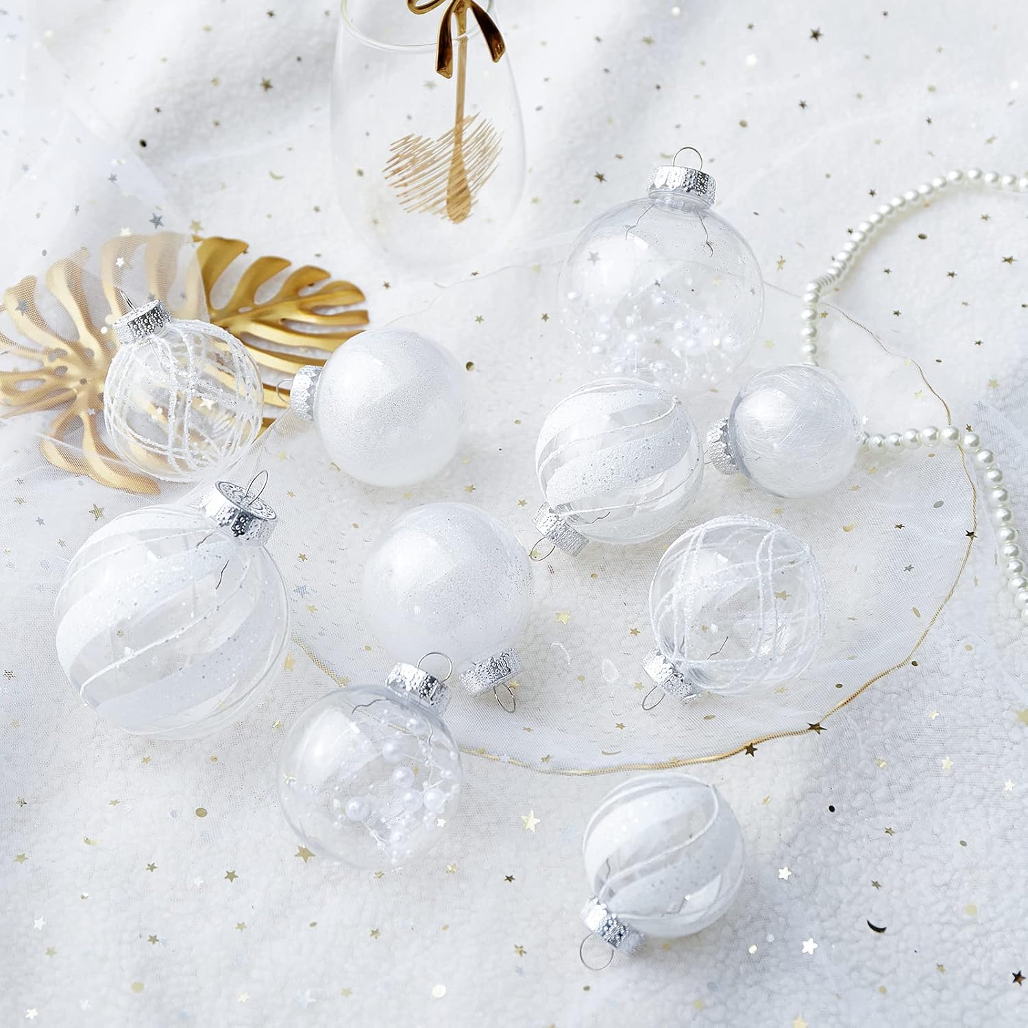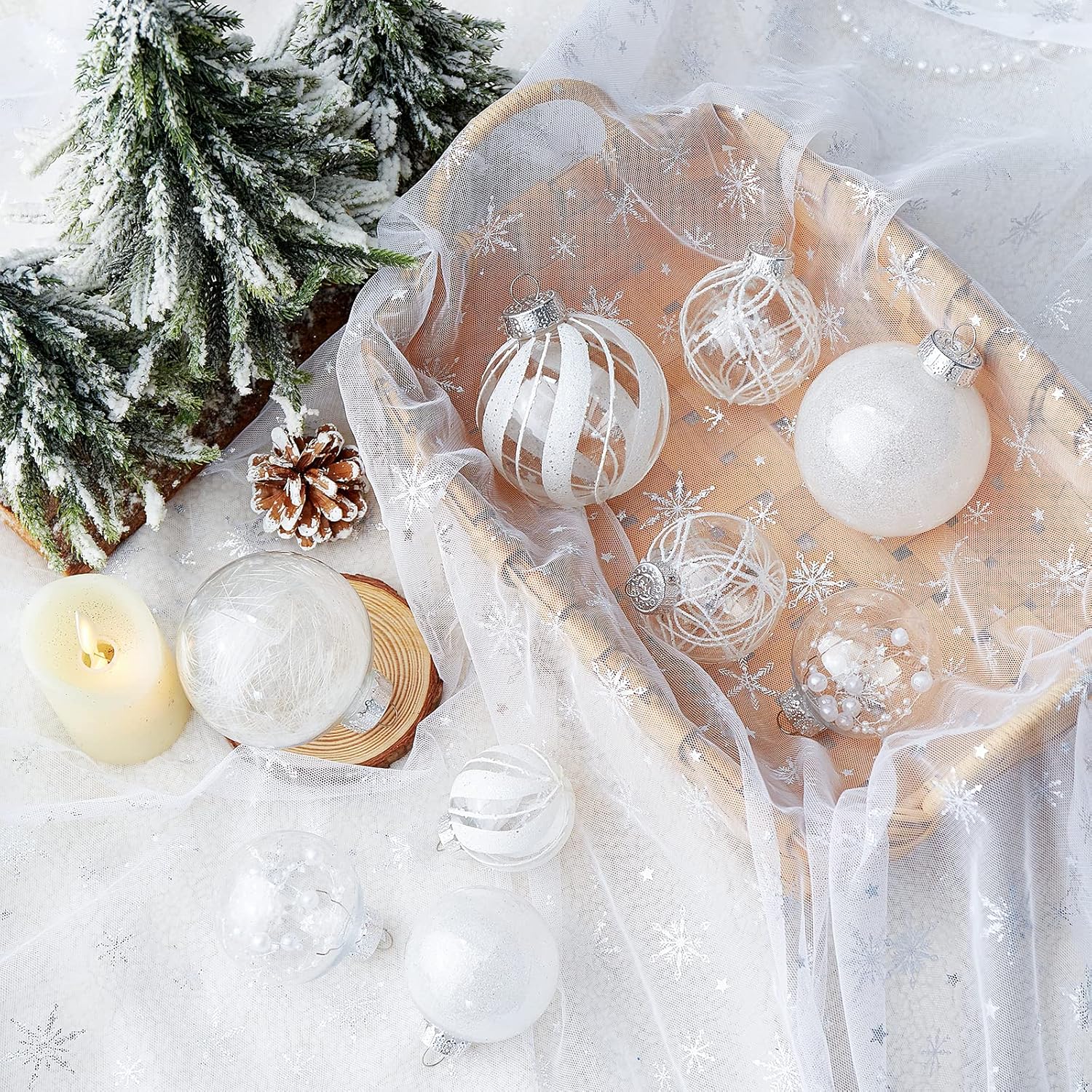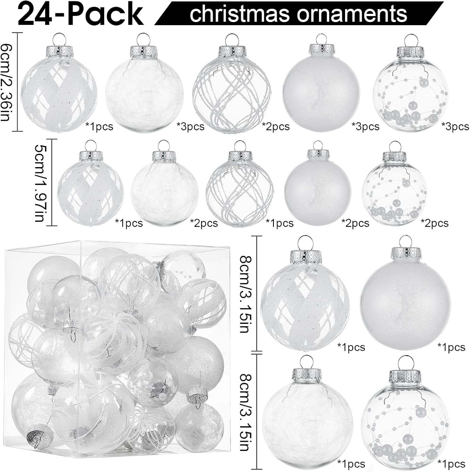 - White Christmas Ball Ornaments--These 24ct clear Christmas decorations are made of durable and environmentally friendly plastic with excellent shatter resistance. These Christmas balls have shiny decorations and a transparent glaze base, which are perfect for hanging on your Xmas tree and decorating your Home with them,this will become part of your vacation.