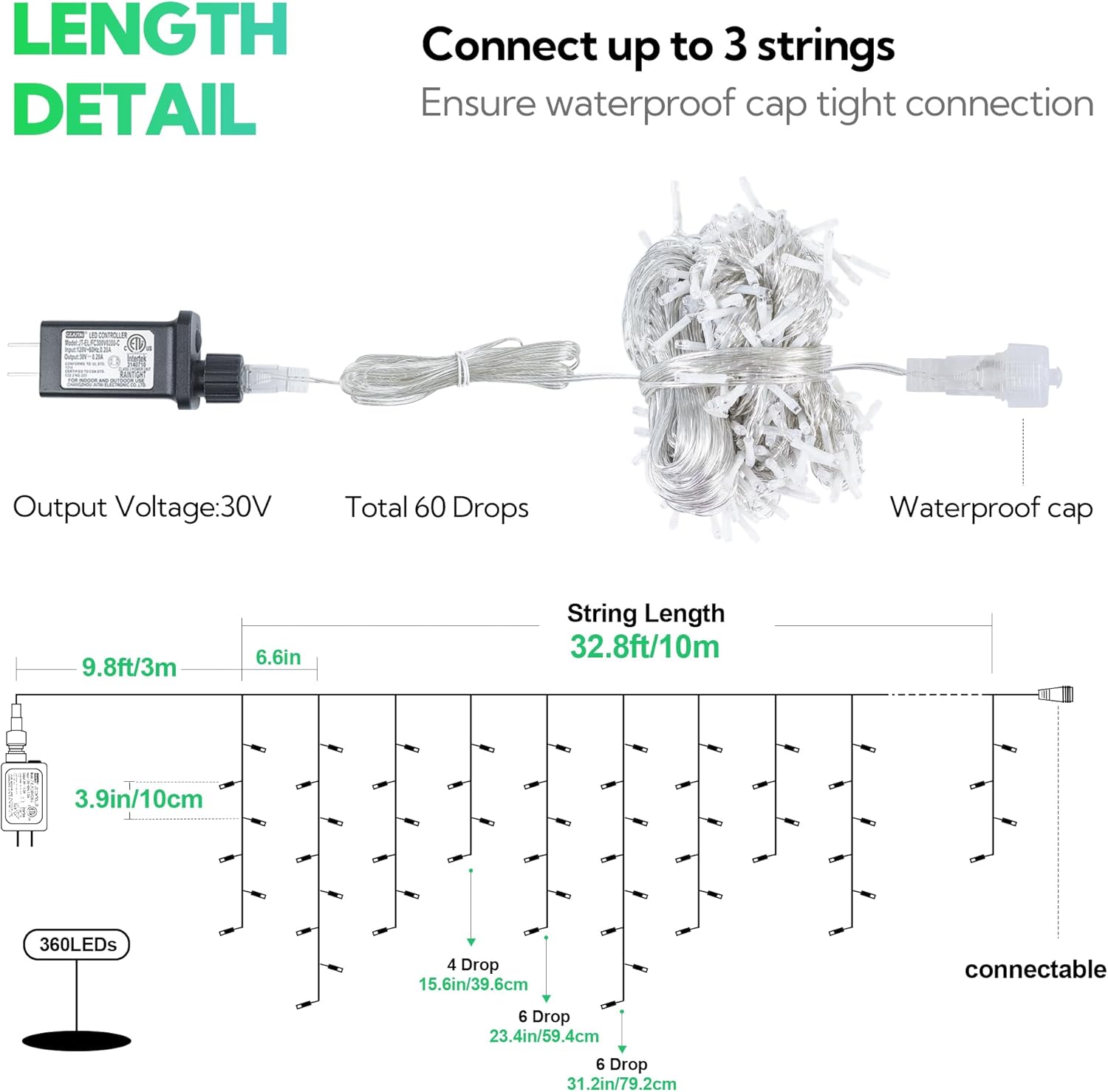 Hopolon 33FT 360L LED Christmas Icicle Lights Outdoor Waterproof,8 Modes Plug in Curtain String Lights with 60 Drops,Christmas Lights for Wedding,Party,Bedroom,Home,Garden,Wall Decorations(Green)