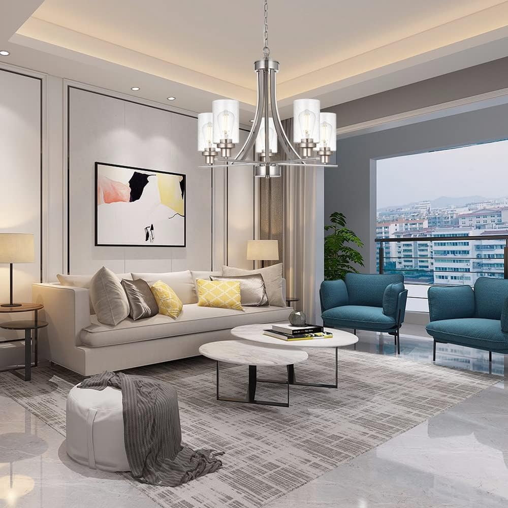 • ๐Ÿ’Ž Adjustable : Chandelier: 20" (H) x 22.5" (D). Clear Glass Shades: 6" (H) x 4" (D).Canopy: 5.11" (D) , includes 57" of adjustable chain,you can adjust the hanging height as per your request.
