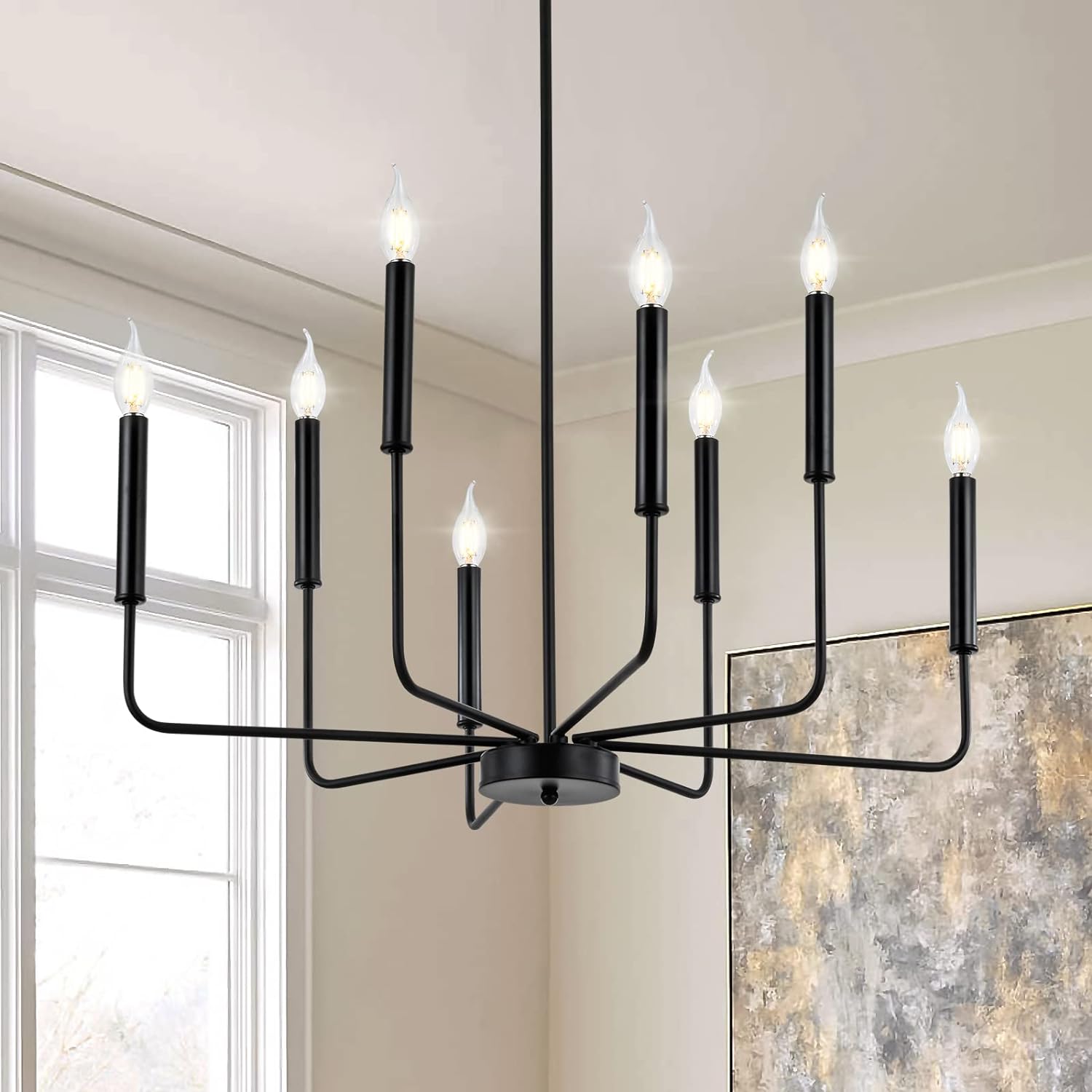 - Modern Fashion Design: A classy candelabra chandelier with different lengths of arms and black matte finish which allows you to clean easily. The appearance of 8 uneven arms look genuine and novel. The whole minimalist design is classic but not rigid. With this simple and retro look can upgrade your space that is elegant but generous