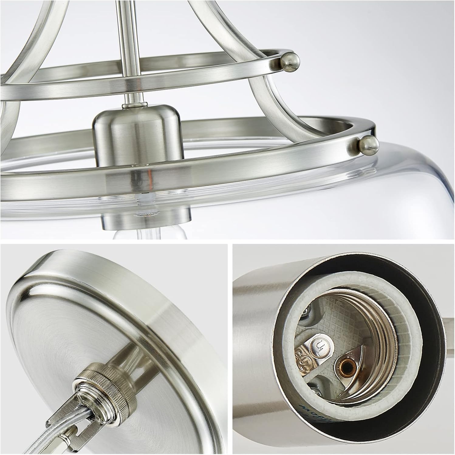 WUZUPS Chandelier Rustic Farmhouse Industrial Round Ceiling Pendant LED Light Fixture with Clear Glass Shades for Dining Room Kitchen Island Foyer Entryway, H 17" x W 13.4", E26 Base, Brushed Nickel