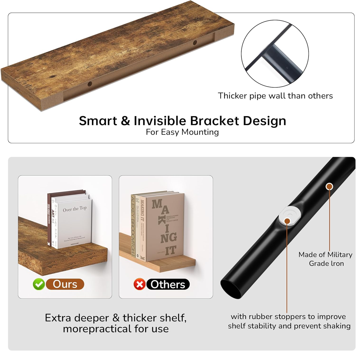 - Extra Deeper & Thicker - This wall shelf measures 36"W x 10.23"D x 1.8"H. Extra deeper and thicker design in order to bring maximizes storage space and weight capacity, even hold up to 70 lb. This floating shelf taking up zero square feet, reduces clutter and highlights dΓ©cor in compact spaces.