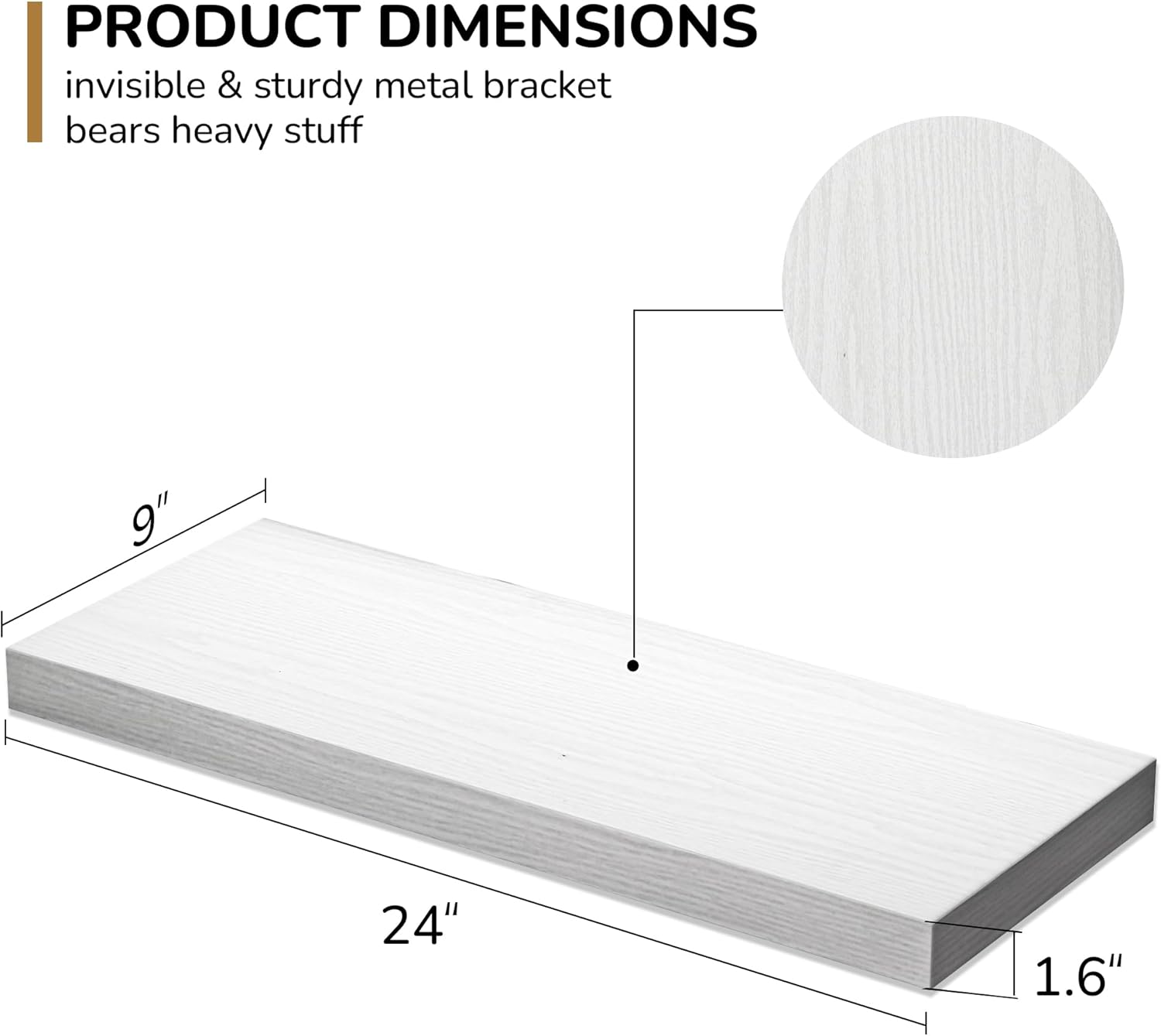 - Extra Deeper & Thicker - Each board measures 24"W x 9"D x 1.6"H. Extra deeper and thicker design in order to bring maximizes storage space and weight capacity, even hold up to 50 lb each. This floating shelf taking up zero square feet, reduces clutter and highlights dΓ©cor in compact spaces.