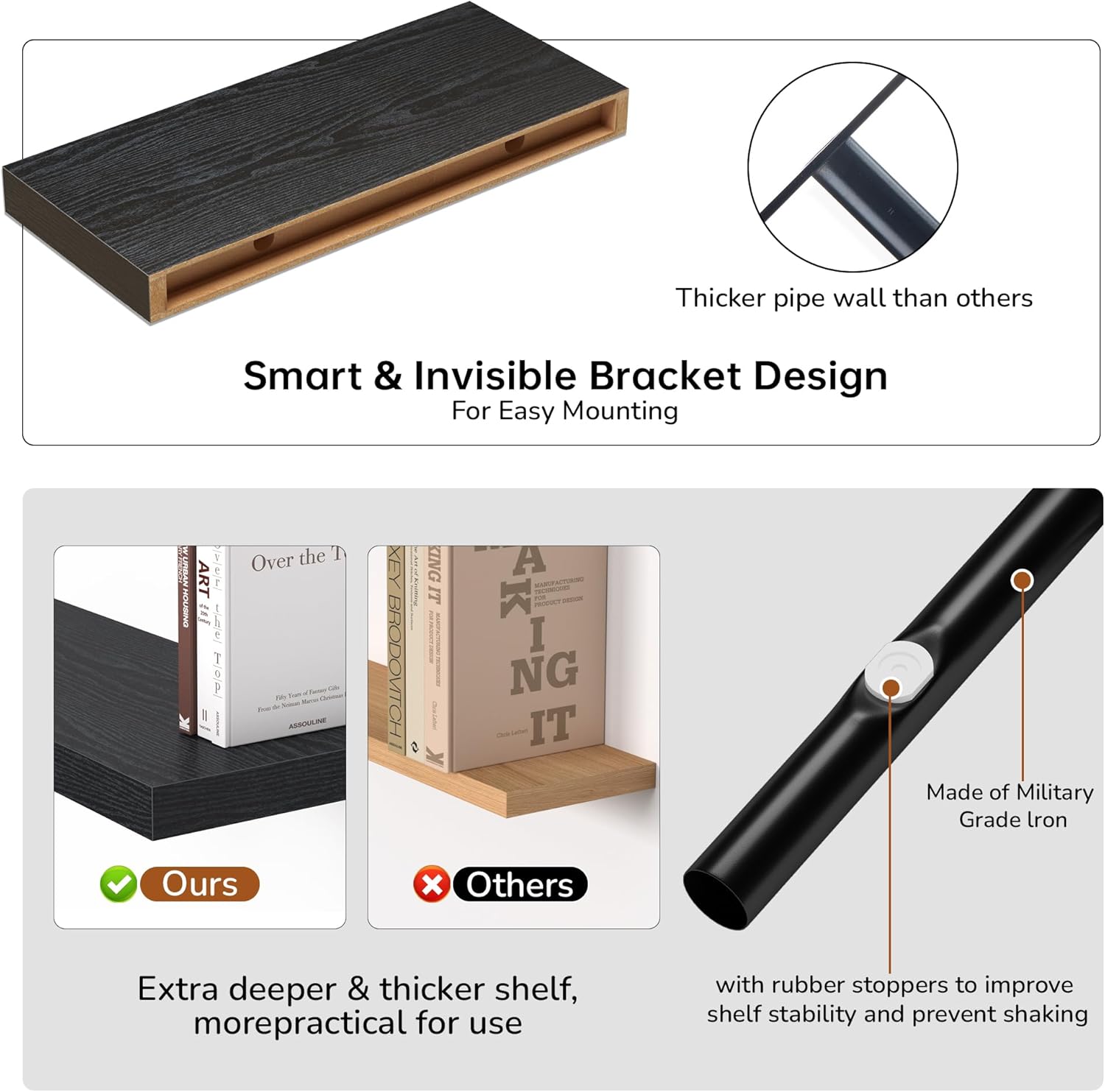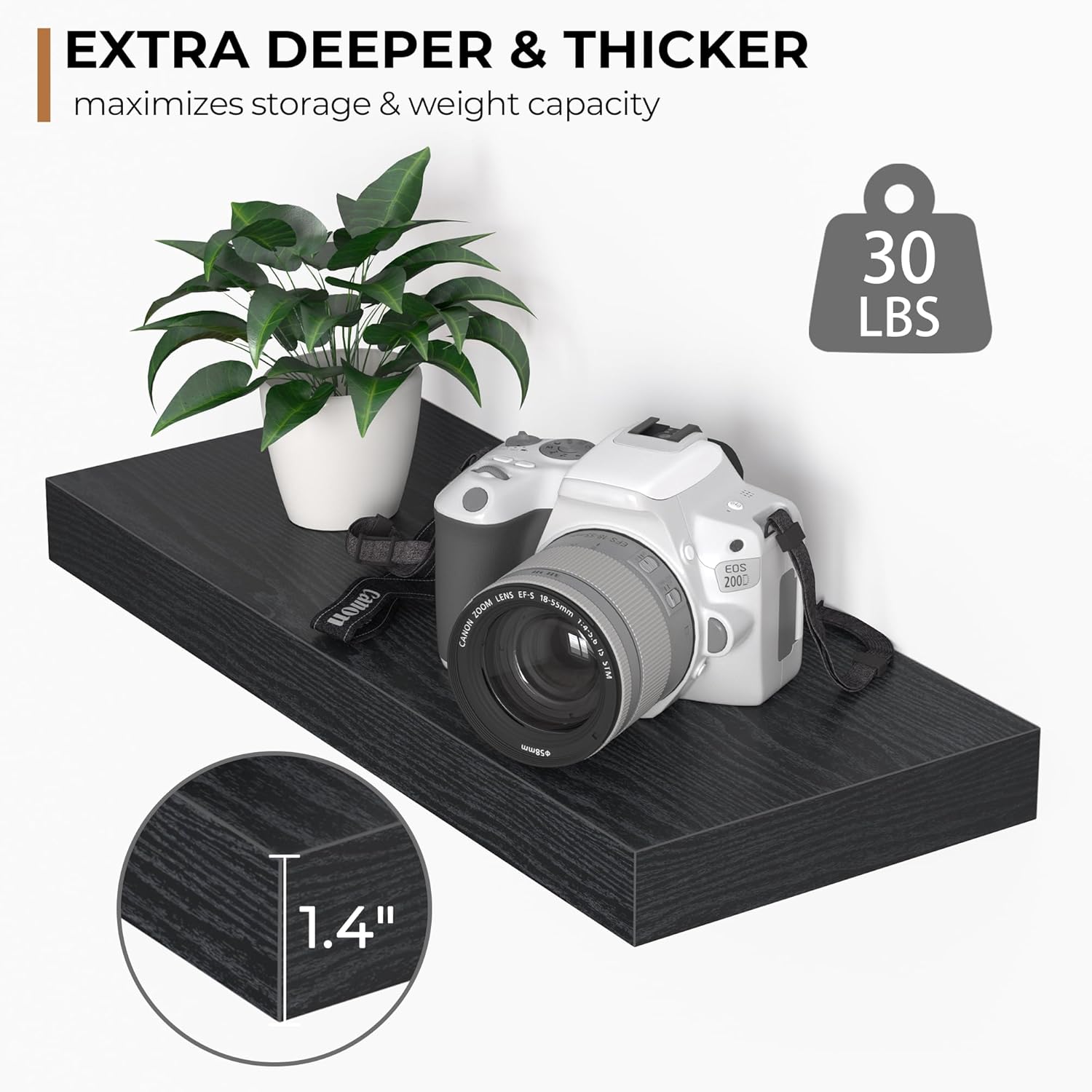 - Extra Deeper & Thicker - Each board measures 16"W x 6.7"D x 1.4"H. Extra deeper and thicker design in order to bring maximizes storage space and weight capacity, even hold up to 30 lb each. This floating shelf taking up zero square feet, reduces clutter and highlights dΓ©cor in compact spaces.