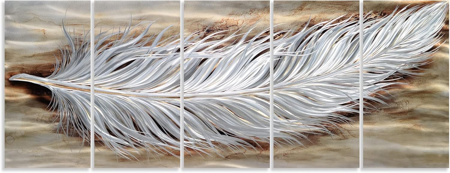 Yihui Arts Rustic Feather Metal Wall Art, Brown and Silver Aluminum Artwork, 5 Panels Artwork for Living Room Farmhouse Dinning Office Decor