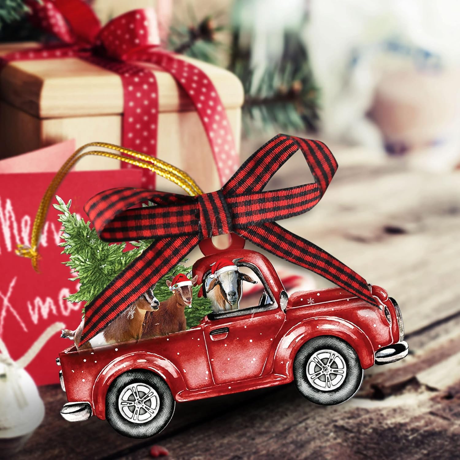 Talataca Goat Red Christmas Truck Pine Tree Farm Animal Lover 2D Flat Christmas Tree Wood Ornament Decor Wooden Hanging Decoration House Present Xmas Eve Keepsake Decorative