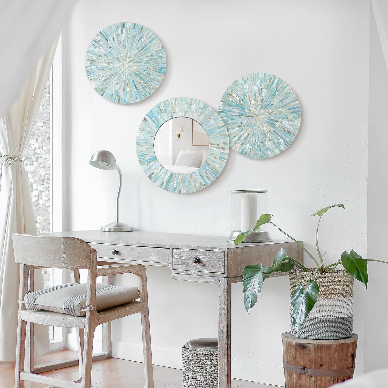 Beach Mirror Wall Decor for Living Room, 3PCS Natural Mother of Pearl Coastal Wall Art Bedroom Bathroom Decoration, Handmade Ocean Round Wall Hanging Sculptures for Home Office Holiday Hotel