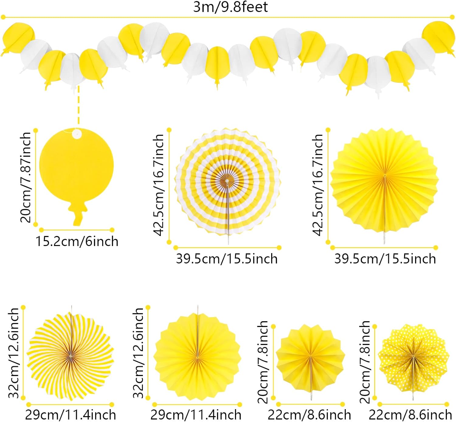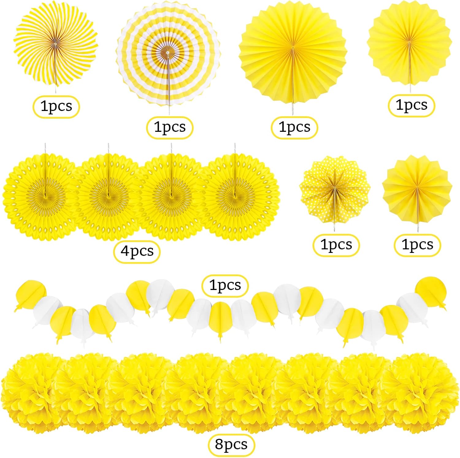 - 【What you will get】6 x paper fans, 8 x paper pompoms, 4 x paper hollow fans, 1 x paper hot air balloon garland (Color: Yellow)