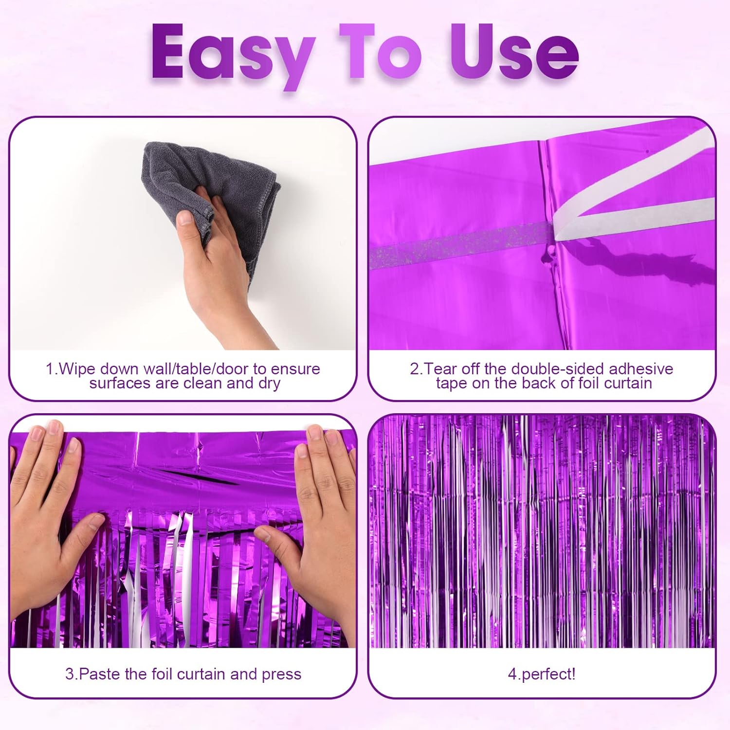 - Premium Material: This purple foil curtain backdrop is made of stable tinsel, non-fading, stay shiny and reusable. Unfold it and then enjoy your glittering party
