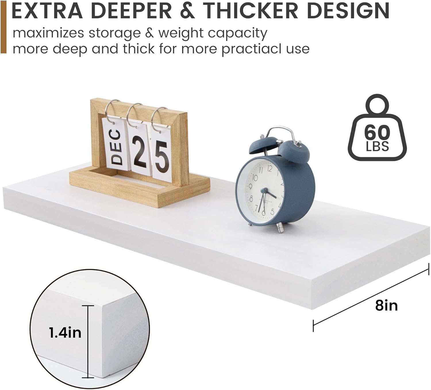 - Extra Deeper & Thicker for Storage - Each board measures 24"W x 8"D x 1.4"H. Extra deeper and thicker design in order to bring maximizes storage space and weight capacity, even hold up to 60 lb. This floating shelf taking up zero square feet, reduces clutter and highlights dΓ©cor in compact spaces. It can help make full use of the empty wall, making it much more space-saving and making your room look larger and tidier.