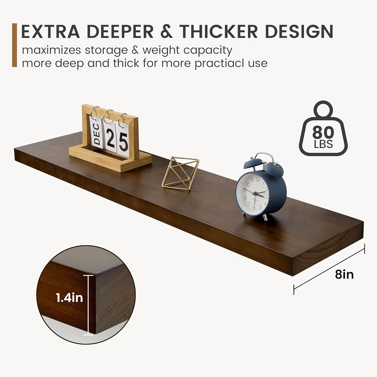 - Extra Deeper & Thicker for Storage - Each board measures 36"W x 8"D x 1.4"H. Extra deeper and thicker design in order to bring maximizes storage space and weight capacity, even hold up to 60 lb. This floating shelf taking up zero square feet, reduces clutter and highlights dΓ©cor in compact spaces. It can help make full use of the empty wall, making it much more space-saving and making your room look larger and tidier.