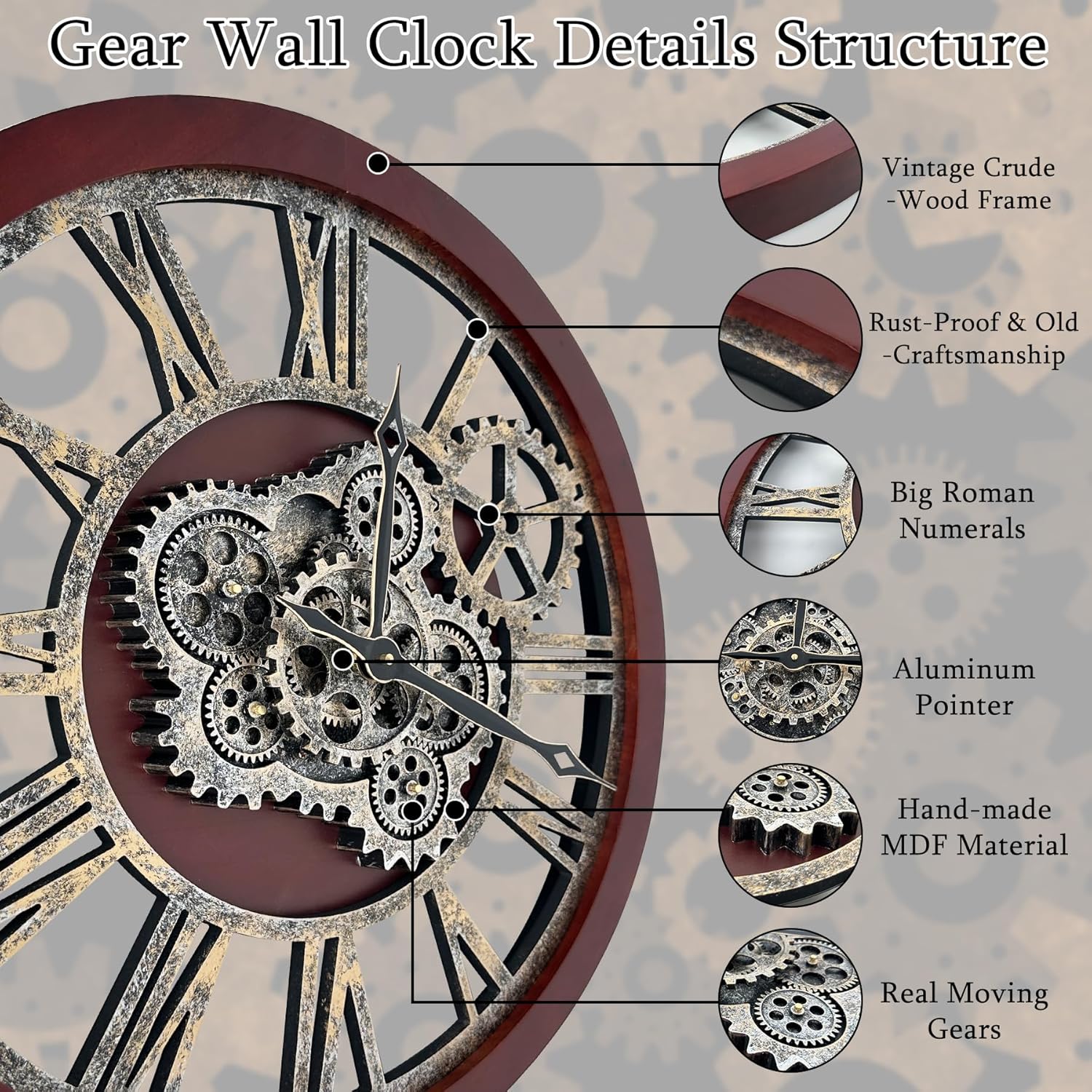 - ăReal Moving Gear ClockăAll gears for the wall clock are real moving! Design with rustic bronze-color and industrial style. An creative combination of four gears for a retro look, has a very exquisite decorative effect makes the wall clock become a chic art works. The large wall clock crafted of nature wood & MDF. Big roman numeral numbers and wood rustic moving gears perfect for any room decor.