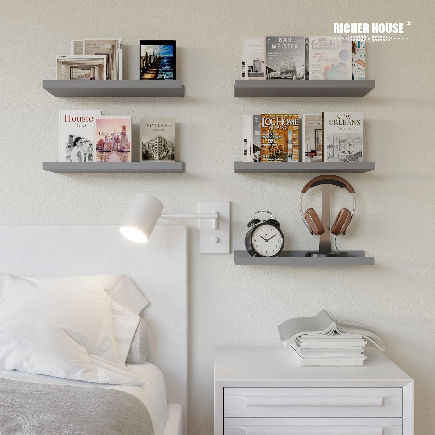 RICHER HOUSE Mounted Shelves for Wall Decor, Modern Picture Ledge Shelf with Lip for Wall Storage Nursery, Bedroom, Living Room, Bathroom - Grey