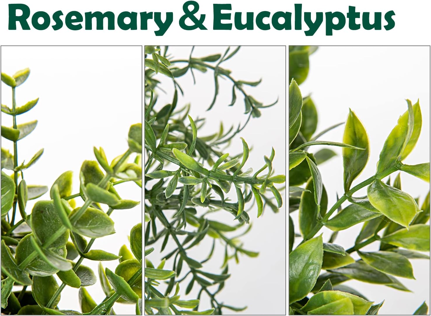 • Material - These 3 fake potted plants with fake plants are made of high quality PE plastic. Roots and branches have clear veins and the natural color gradient catches the eye at first glance.This set of Mini Potted Greenery features eucalyptus, boxwood and rosemary in assorted green tones, potted plant small perfect for creating a comfortable atmosphere you can enjoy for the years to come.