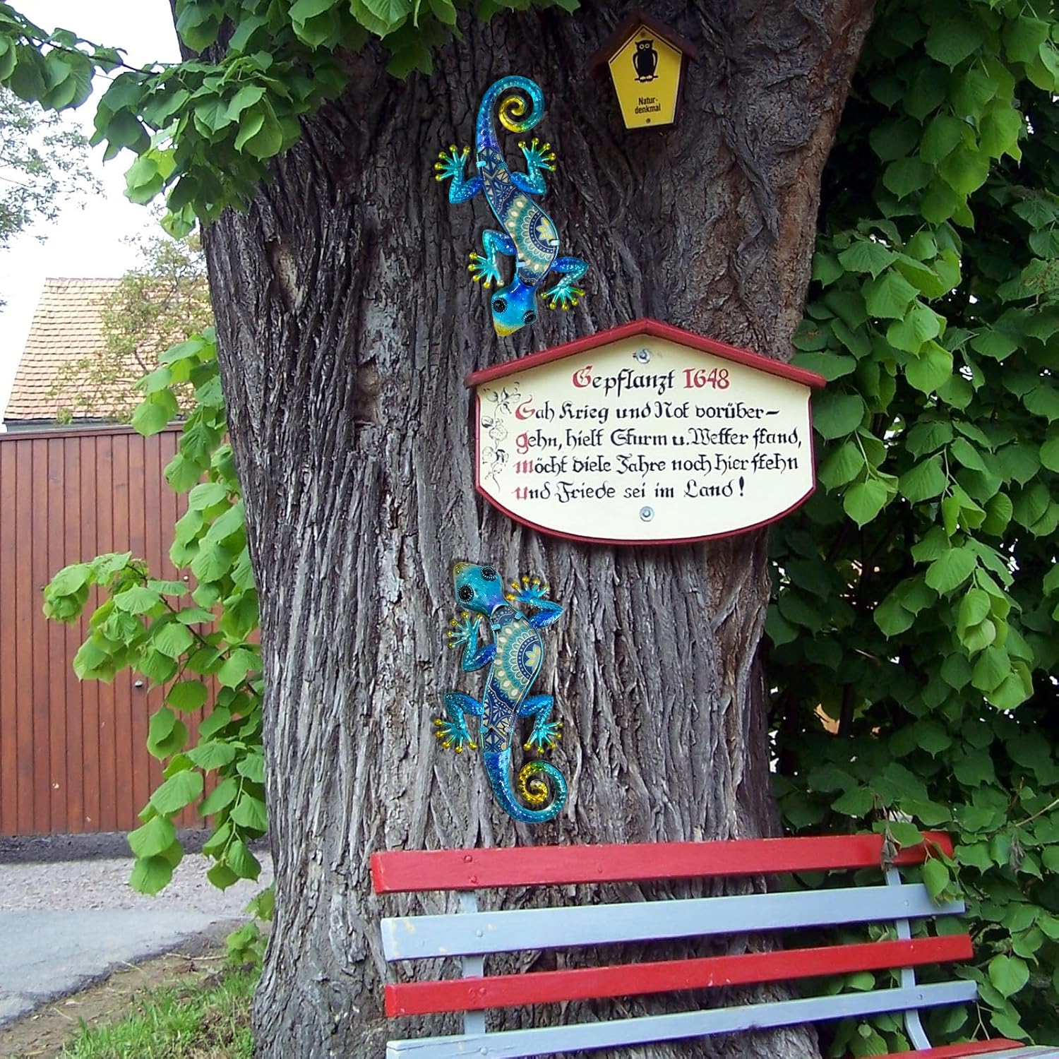 - 🦎【Design】 metal lizards outdoor decor measures 12*5.5*0.6 inch,suitable size for any space. Exquisite lizard wall-hanging suit uses Dreamy blue gradient as the main color, with the same color Bohemian pattern, vivid curly tail and 3d eyes, which will bring special decoration to your garden