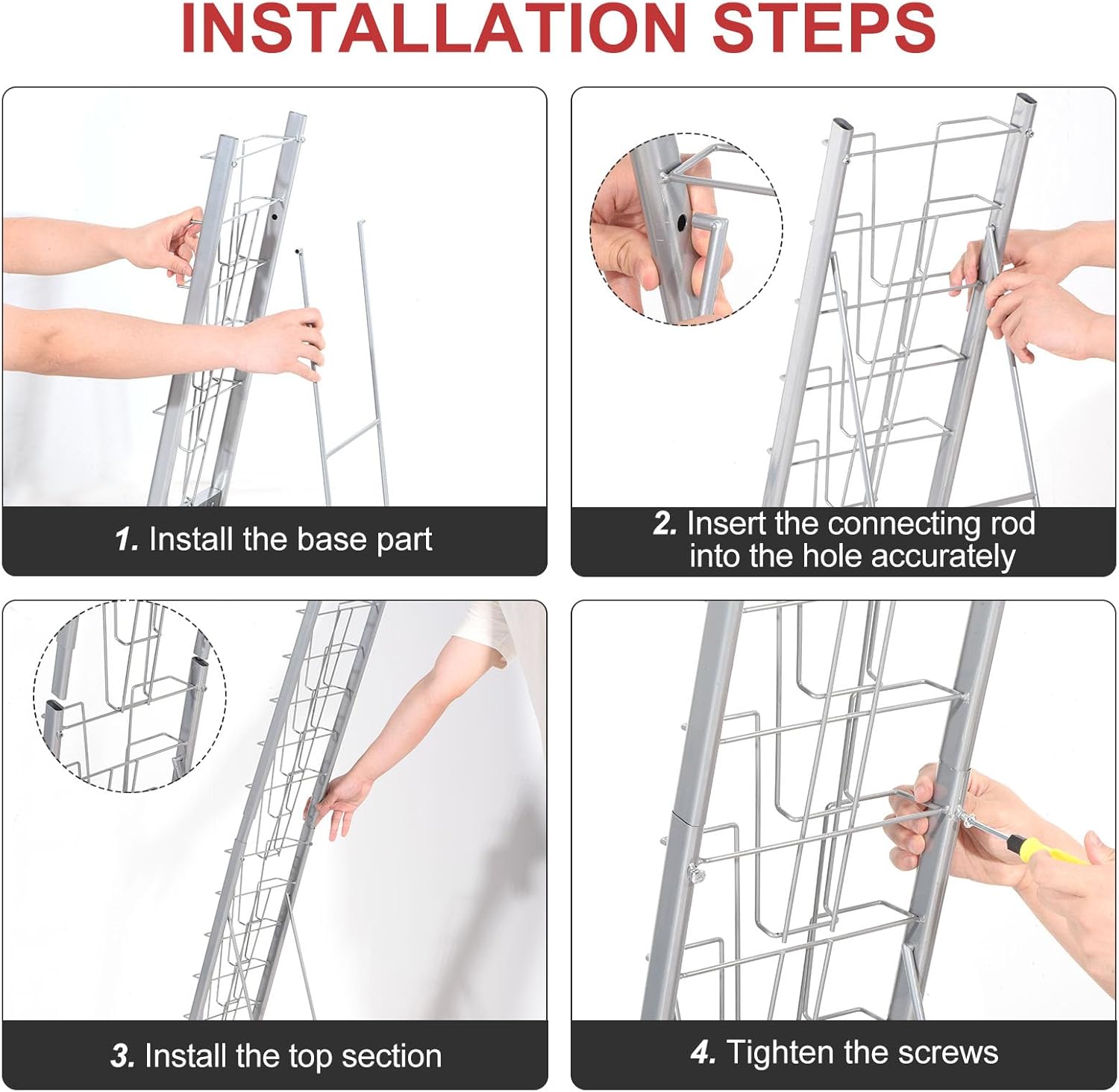 - Detachable Rack: The detachable design of this magazine display rack allows you to store the display stand in seconds and comes with a screwdriver. Unfolded Size(150 x 36 x 25.4cm / 59 x 14 x 10 inch)