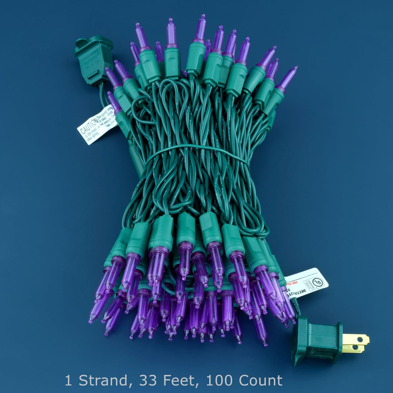 - SPECIFICATIONS β Each pack contains 1 strands of one-piece string lights, total length 33 feet with 100 count purple mini lights. 22 AWG green cord, 4" lead, 4" spacing, 4" tail.