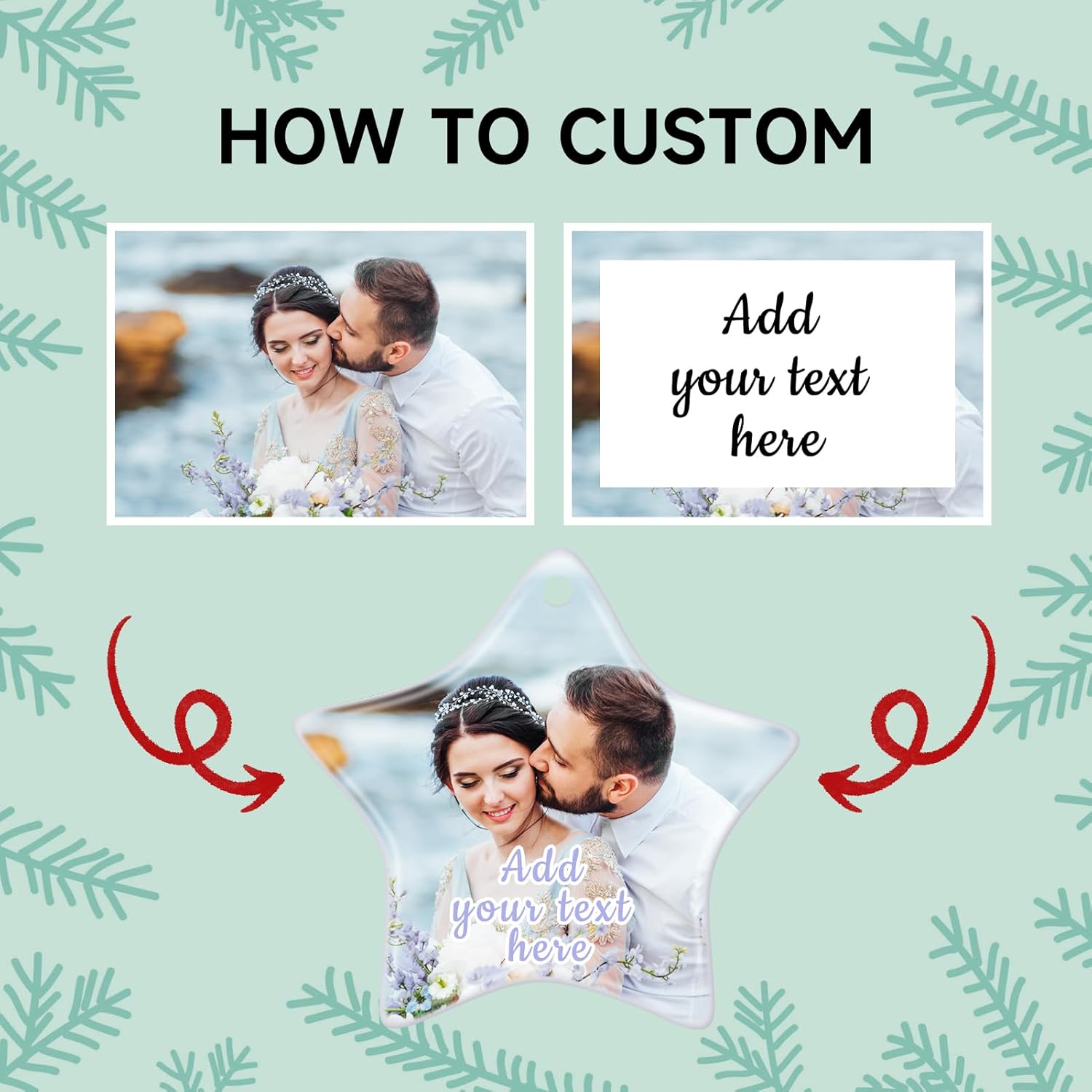 - 【Custom Photo Text Christmas Ornaments】Click on the " Customize Now " button to design your own Christmas ornament special with desired Photo, Picture, Logo, Text. Simply upload any photo, fit by the corners. Choose your font color, fill in the optional blank with your text. Our designers will do the rest.