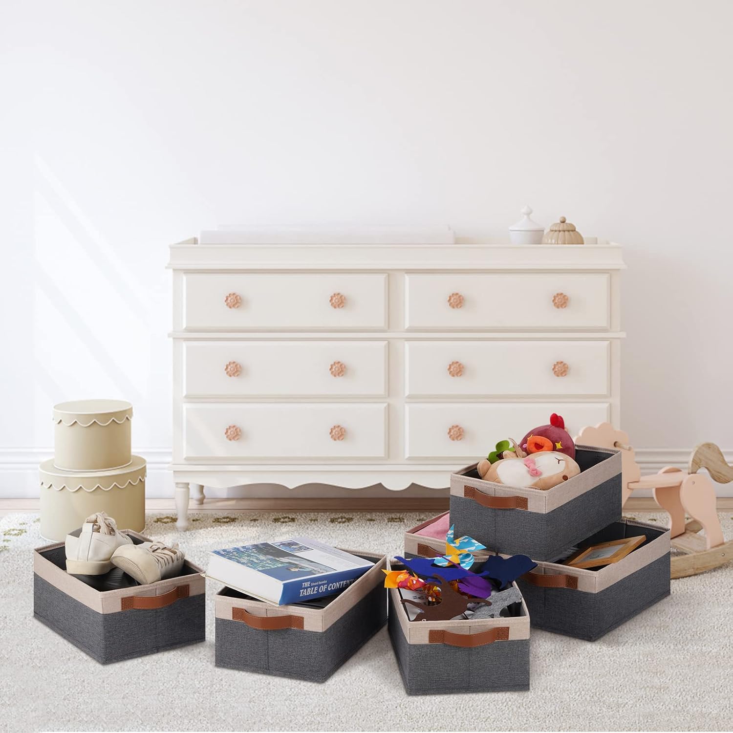 - 👍【MULTI-PURPOSE】Sturdy storage baskets provides a solution to meet many storage needs; Used to organize and store baby products, toys, clothes, shoes, towels, toiletries, books, DVD, office supplies, pet supplies, baskets for gifts empty. The decorative storage bins can be easily placed in the shelf, closet, bedroom, living room, dormitory, study, bathroom, laundry room, office and much more.