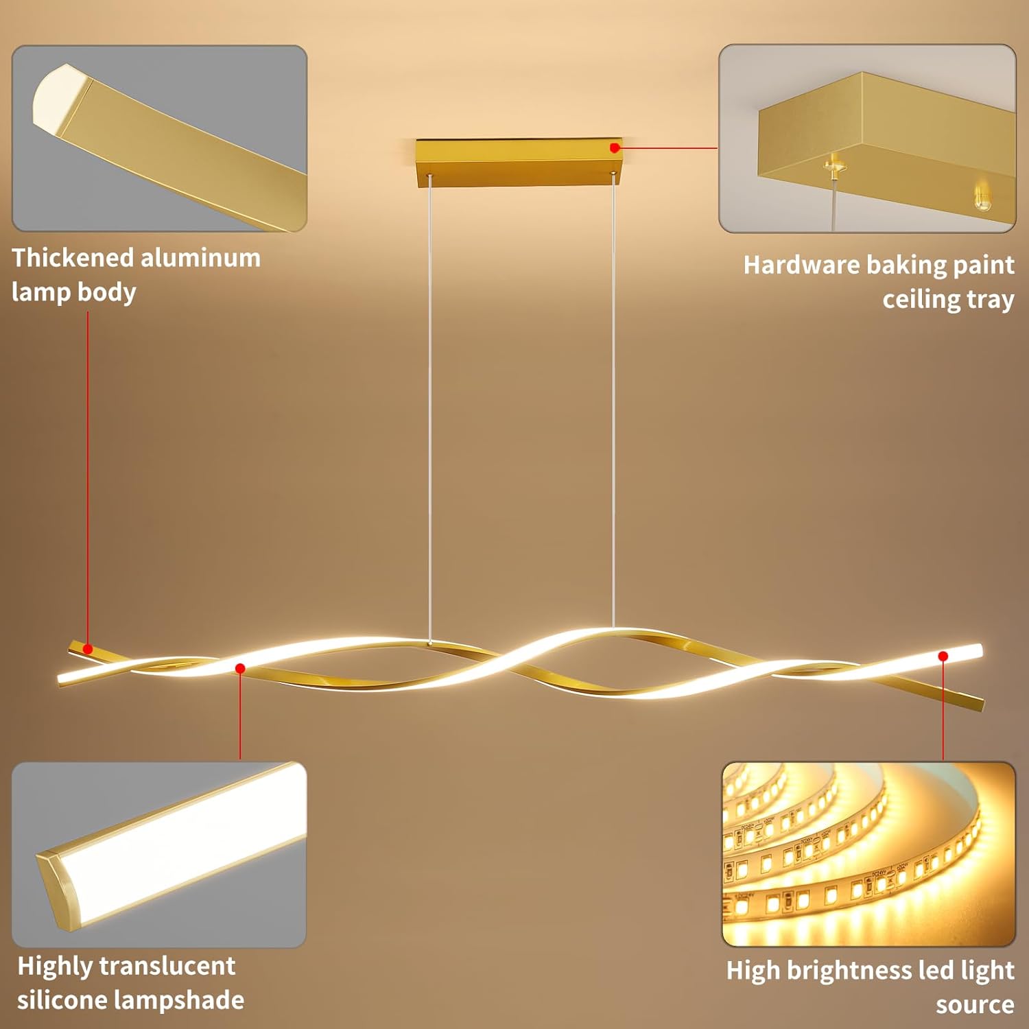 Modern Ceiling Pendant Light, with Remote Control Dimmable 3 Color Mode & Brightness Ceiling Lamp, Anti-Flicker Dining Light Fixture for Kitchen, Dining Room (Gold, 59IN)