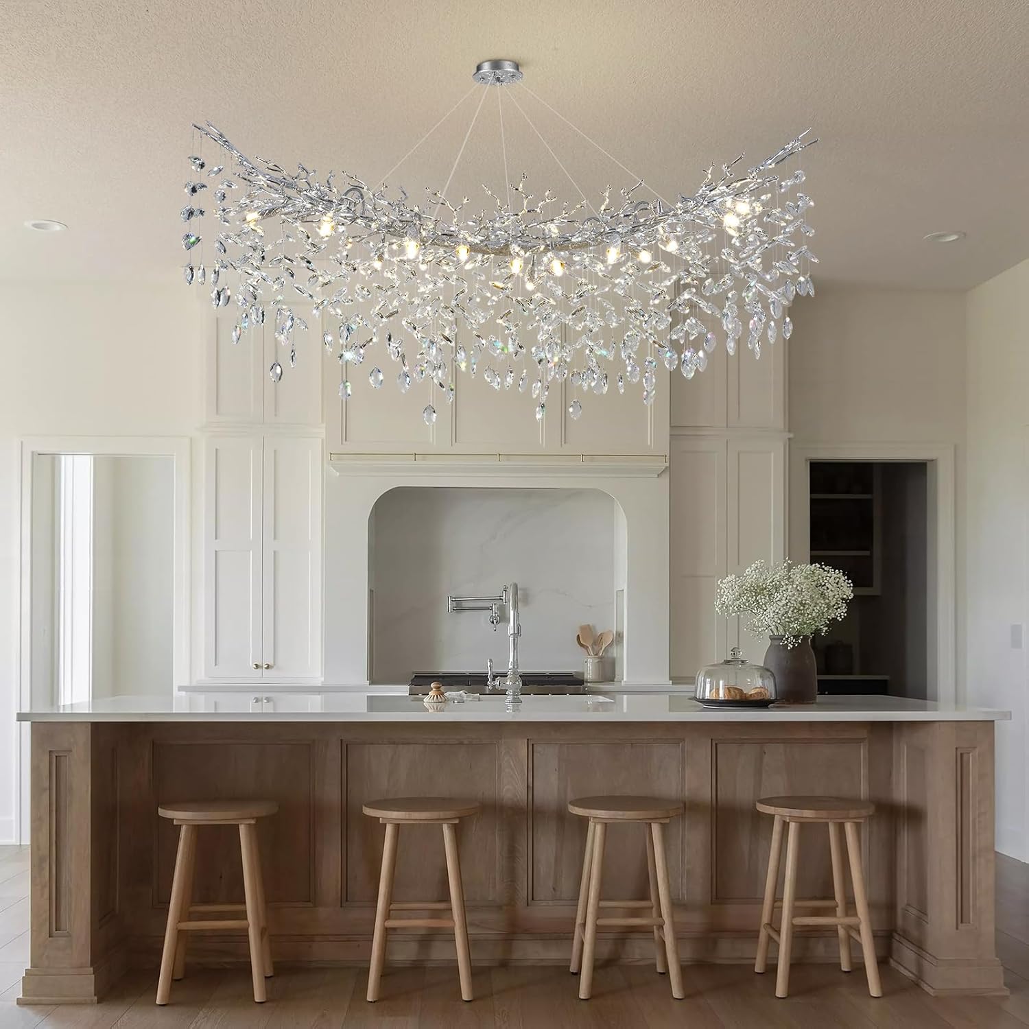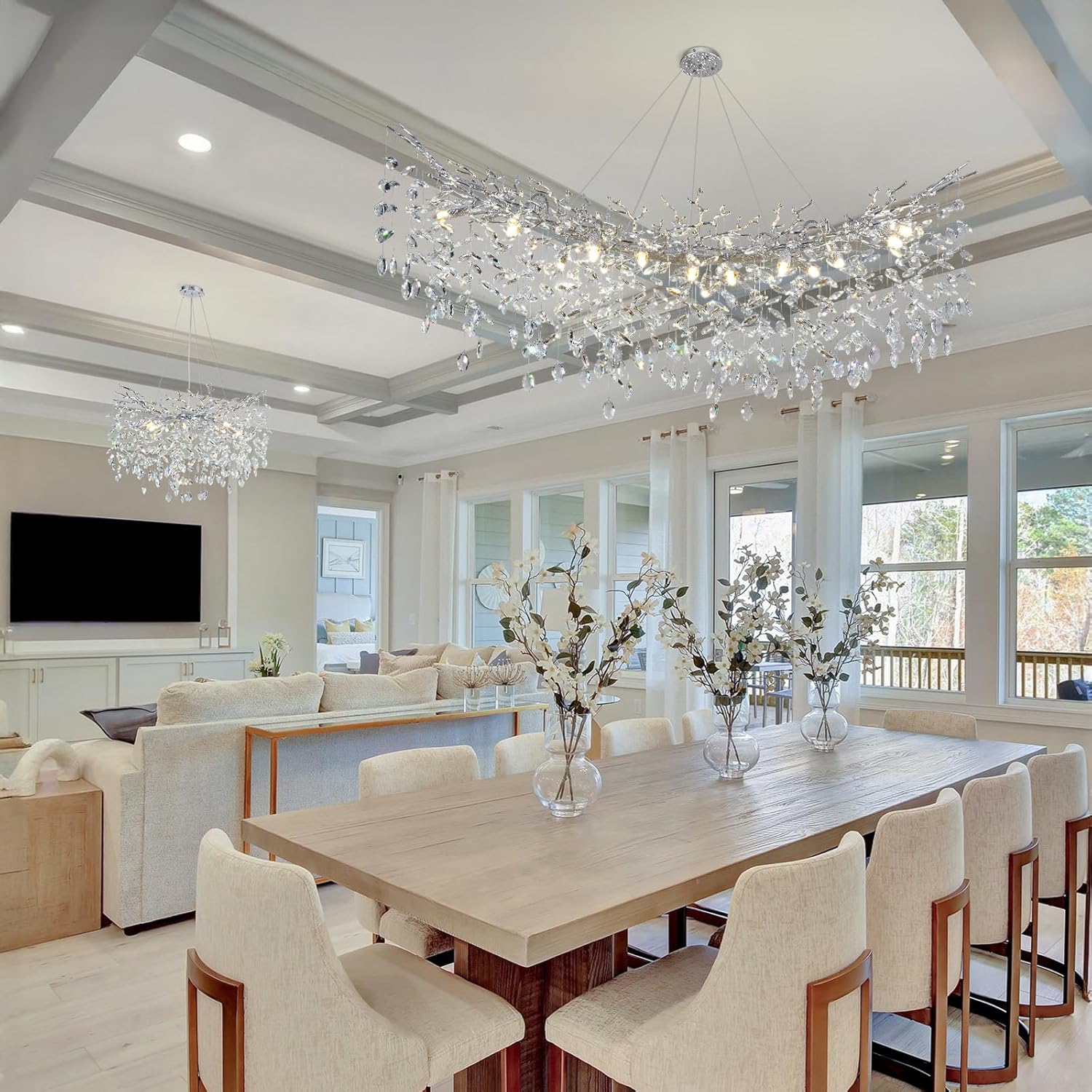 Modern Crystal Silver Chandelier, 55" Large Rectangular Oval Tree Branch Crystal Chandeliers for Dining Room,16-Light Flush Mount K9 Crystal Chandeliers, for Kitchen Island,Dining Room