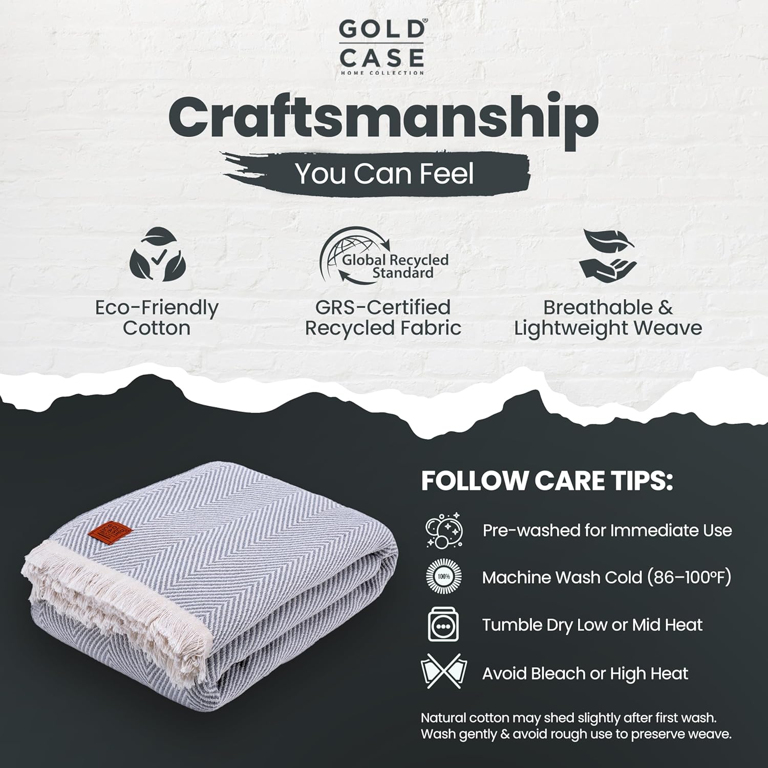 Gold Case Throw Blanket for Bed – 100% Recycled Turkish Cotton Bed Blanket – Decorative Throw Cotton Blankets for Living Room & Bedroom – Elegant Grey Woven Queen Blankets – 90x90