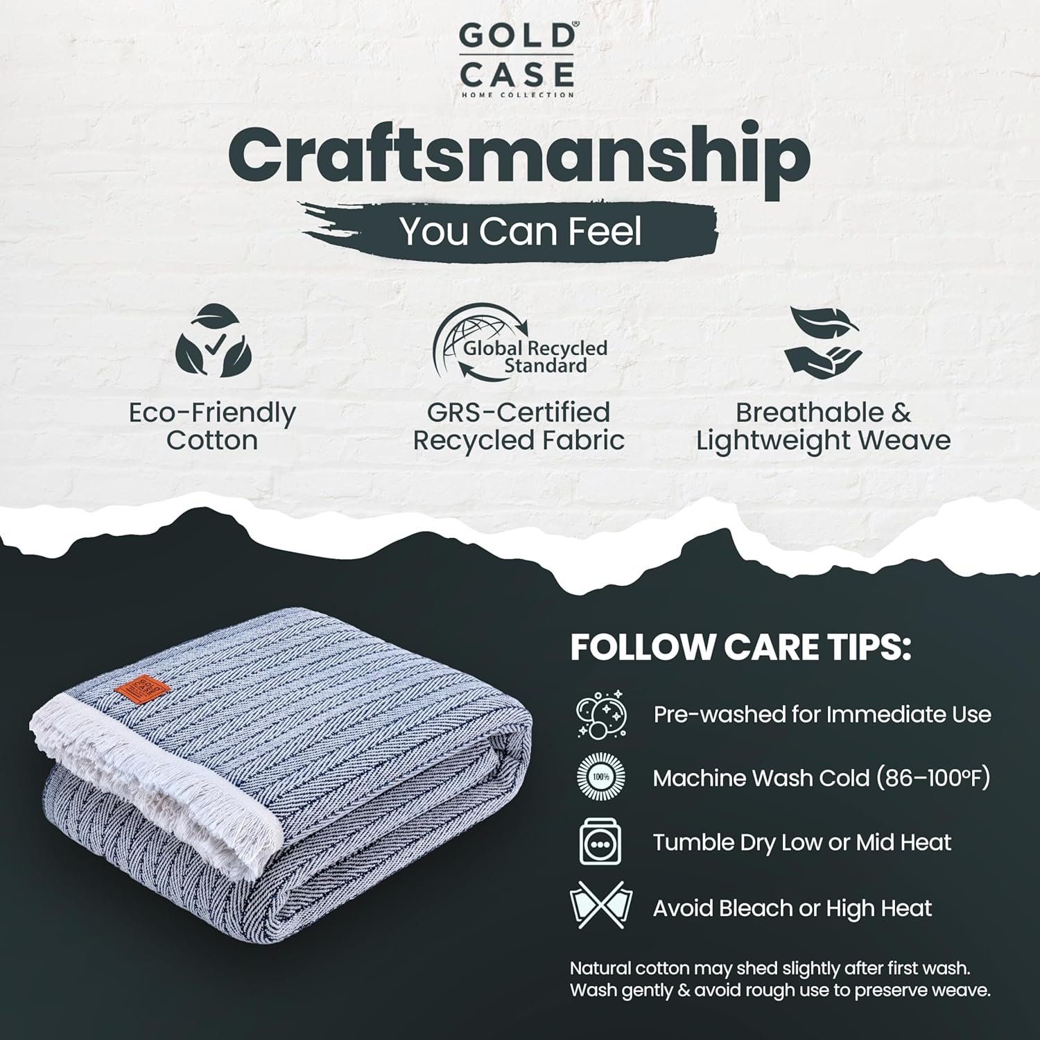 Gold Case Throw Blanket for Bed – 100% Recycled Turkish Cotton Bed Blanket – Decorative Throw Cotton Blankets for Living Room & Bedroom – Vintage Navy Blue Woven Queen Blankets – 90x90